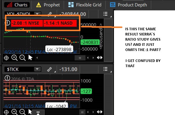 Hello, I´m terrible at math and programming. My doubt is: Are the values we get in the ratio study (and the ratio charts for instance, the UDVR (up down volume ratio chart from market internals) in that 2:1 (3:1, 5:1) format? You just thought there was no need to add the :1? Because I was watching some videos on youtube about market internals and in all of them they are using thinkorswim, they have for example the market breadth chart opened which gives the net value, but they have some kind of study or indicator overlay that also gives in this ratio format like "3:1" or "1.3:1". What I´m trying to say is: Is it safe to assume that the ratio value that I get from the UDVR chart at sierra (which only gives me the value like this: 1.80, 2, 3.5, 10, 20.6... etc... It´s the same thing, they just don´t have the ":1" after them, or I have to use another study to convert to that format? Thanks |