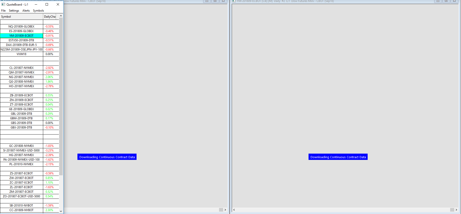 Yes the data is coming from the Sierra Chart Exchange Data Feed and most of the data is already on your system. Only the most recent missing data is being downloaded. Not sure why that would be slow. Refer to: Historical Intraday Data (Missing Data / Download Errors / Viewing More Data): Improving Historical Intraday Data Downloading Performance Those charts are Continuous Futures Contract charts. Might be best not to link a Quote Board to a continuous futures contract chart. Refer to the following setting: Chart Settings: Continuous Contract (Chart >> Chart Settings >> Symbol >> Symbol menu) Sierra Chart Support - Engineering Level Your definitive source for support. Other responses are from users. Try to keep your questions brief and to the point. Be aware of support policy: https://www.sierrachart.com/index.php?l=PostingInformation.php#GeneralInformation For the most reliable, advanced, and zero cost futures order routing, *change* to the Teton service: Sierra Chart Teton Futures Order Routing Date Time Of Last Edit: 2018-06-15 16:45:25