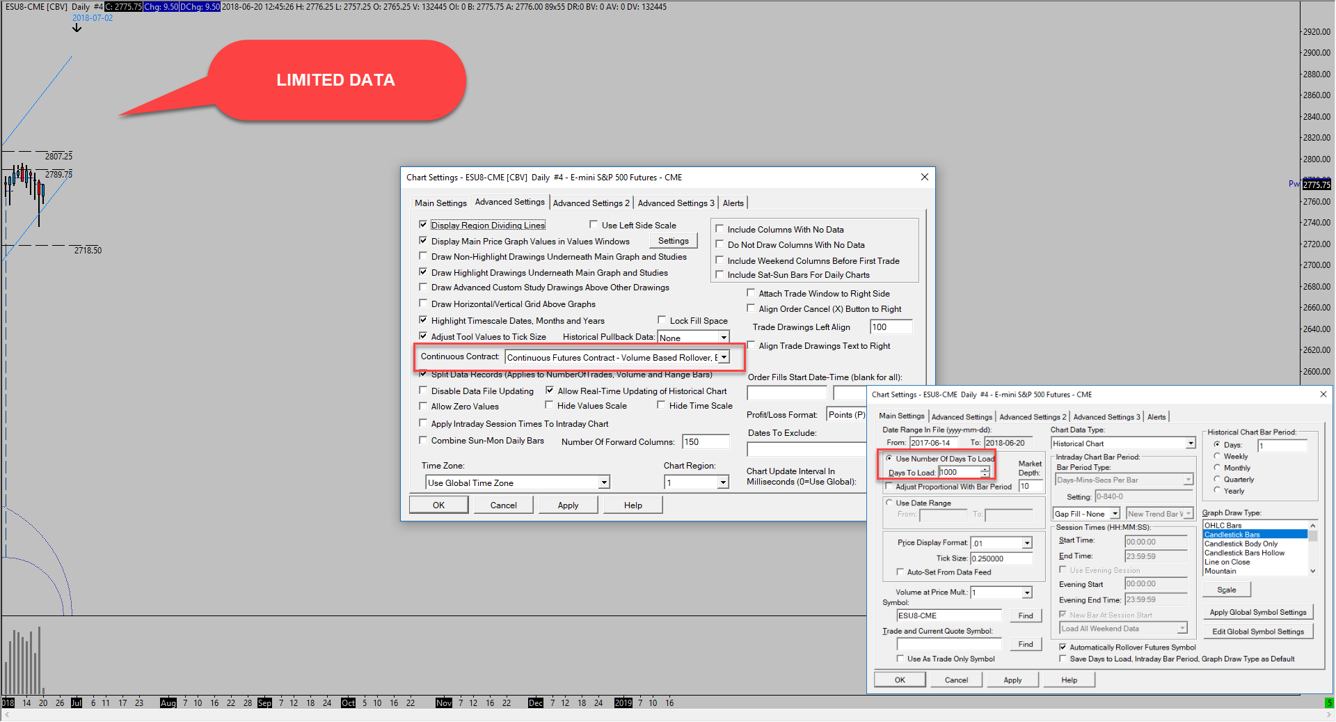Just now I set Sierra with Rithmic data, but I have a problem to download Historical data. Attached daily chart with the Setting setup. If I set in Advanced Setting / Continuous Contract: Continous Futures Contract - Volume based rollover, Back Adjustment /// The data is very limited If I set in Advanced Setting / Continuous Contract: NONE /// The historical data are few how can I resolve, taking into account that I have deleted and redone data download -- Antonio |
