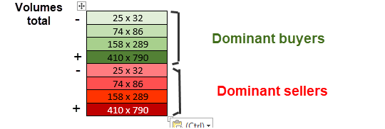 Hello, I read the user manuel, but I can not find a response to my question, perhaps you have the solution ? I would like to have a method of coloring for each price (each level of price with two parameters : 1) choice of color for all the price level based on dominant side (for example green for buyers dominants and red for sellers dominants); 2) shading of the color (red or green) based on total volume (buy + sell) at each price, more total volume = the darker the color with several shading of color, at least four Date Time Of Last Edit: 2018-06-26 12:20:17