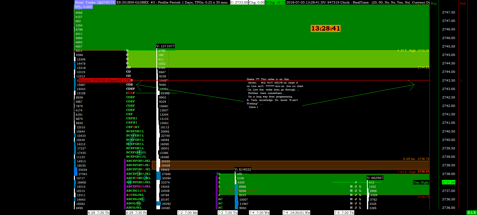 On Live account ???? With Trade Window?? Will not put entry on my TPO Chart??? [visual ~~] Has Been Working ~~~~ Will put it on Sim 1 chart ??? Thx Gene :) |