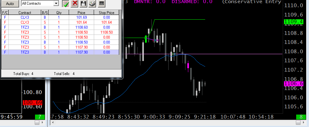 Here is the Trade Activity log for todays order error placement. The beginning of the Log shows the disconnection from the feed and then a reconnect and it got rid of the orders after I flattened from the DOM. Next I had placed a buy stop above price from the chart, Once the order was reflected on my DOM I chose "Flatten and Cancel" from the chart, just to see if there was something up, then the chart initiated a sell stop at 1107.5. Maybe it was thinking there was an order somewhere? After that order was flattened I tried to replicate the problem but it did not. You can see this in the following order cancellations on the log after the 1107.5 order. Lets figure out whats going on, not trying to be pushy here, I am seeing something that isn't normal, thats all. Here is todays trade activity log and the picture corresponds with the orders placed on the account. ActivityType DateTime Symbol OrderActionSource InternalOrderID ServiceOrderID OrderType Quantity BuySell Price Price2 OrderStatus FillPrice FilledQuantity TradeAccount OpenClose ParentInternalOrderID PositionQuantity FillExecutionServiceID Order 2013-10-18 08:59:21.000 TFZ3 Auto-trade: TFZ3 238 tick #3|Dominator On|BuyEntry 41497 Limit Sell 1118.7 Pending Child 33166 Close 41496 Order 2013-10-18 08:59:21.001 TFZ3 Auto-trade: TFZ3 238 tick #3|Dominator On|BuyEntry 41498 Stop Sell 1107.9 Pending Child 33166 Close 41496 Order 2013-10-18 08:59:21.002 TFZ3 Auto-trade: TFZ3 238 tick #3|Dominator On|BuyEntry 41496 Market 1 Buy Order Sent 33166 Open Order 2013-10-18 08:59:21.003 TFZ3 Transact Futures order report (New) 41496 23334009 Market 1 Buy Open 33166 Open Order 2013-10-18 08:59:21.004 TFZ3 Auto-trade canceled order: TFZ3 238 tick #3|Dominator On 41496 23334009 Market 1 Buy Pending Cancel 33166 Open Order 2013-10-18 08:59:21.005 TFZ3 Canceling child orders of internal order ID 41496 41497 Limit Sell 1118.7 Pending Cancel 33166 Close 41496 Order 2013-10-18 08:59:21.006 TFZ3 Canceling child orders of internal order ID 41496 41497 Limit Sell 1118.7 Canceled 33166 Close 41496 Order 2013-10-18 08:59:21.007 TFZ3 Canceling child orders of internal order ID 41496 41498 Stop Sell 1107.9 Pending Cancel 33166 Close 41496 Order 2013-10-18 08:59:21.008 TFZ3 Canceling child orders of internal order ID 41496 41498 Stop Sell 1107.9 Canceled 33166 Close 41496 Order 2013-10-18 08:59:21.009 TFZ3 Transact Futures order report (Filled). Exchange ID: 11577710 41496 23334009 Market 1 Buy Filled 1 33166 Open Order 2013-10-18 08:59:21.011 TFZ3 Order reactivated. New Internal Order ID: 41499 41499 Limit 1 Sell 1118.7 Order Sent 33166 Close 41496 1 Order 2013-10-18 08:59:21.012 TFZ3 Order reactivated. New Internal Order ID: 41500 41500 Stop 1 Sell 1107.9 Order Sent 33166 Close 41496 1 Order 2013-10-18 08:59:22.000 TFZ3 Transact Futures order report (Canceled) 41496 23334009 Market 1 Buy Canceled 1 33166 Open 1 Order 2013-10-18 08:59:22.001 TFZ3 Transact Futures order report (New) 41499 23334010 Limit 1 Sell 1118.7 Open 33166 Close 41496 1 Order 2013-10-18 08:59:22.002 TFZ3 Transact Futures order report (New) 41500 23334011 Stop 1 Sell 1107.9 Open 33166 Close 41496 1 Order 2013-10-18 08:59:56.000 TFZ3 TFZ3 238 tick #3 | User order modification 41500 23334011 Stop 1 Sell 1107.9 Pending Modify 33166 Close 41496 1 Order 2013-10-18 08:59:56.001 TFZ3 Transact Futures order report (Cancel/Replace complete) 41500 23334021 Stop 1 Sell 1108.1 Open 33166 Close 41496 1 Order 2013-10-18 09:00:06.000 TFZ3 TFZ3 238 tick #3 | User order modification 41500 23334021 Stop 1 Sell 1108.1 Pending Modify 33166 Close 41496 1 Order 2013-10-18 09:00:06.001 TFZ3 Transact Futures order report (Cancel/Replace complete) 41500 23334031 Stop 1 Sell 1108.3 Open 33166 Close 41496 1 Order 2013-10-18 09:00:32.000 TFZ3 TFZ3 238 tick #3 | User order modification 41500 23334031 Stop 1 Sell 1108.3 Pending Modify 33166 Close 41496 1 Order 2013-10-18 09:00:32.001 TFZ3 Transact Futures order report (Cancel/Replace complete) 41500 23334053 Stop 1 Sell 1108.6 Open 33166 Close 41496 1 Order 2013-10-18 09:00:38.000 TFZ3 TFZ3 238 tick #3 | User order modification 41500 23334053 Stop 1 Sell 1108.6 Pending Modify 33166 Close 41496 1 Order 2013-10-18 09:00:38.001 TFZ3 Transact Futures order report (Cancel/Replace complete) 41500 23334055 Stop 1 Sell 1108.5 Open 33166 Close 41496 1 Order 2013-10-18 09:00:43.000 TFZ3 TFZ3 238 tick #3 | User order modification 41500 23334055 Stop 1 Sell 1108.5 Pending Modify 33166 Close 41496 1 Order 2013-10-18 09:01:05.000 TFZ3 Canceling all orders for symbol TFZ3 41499 23334010 Limit 1 Sell 1118.7 Pending Cancel 33166 Close 41496 1 Order 2013-10-18 09:01:05.001 Canceling of order is being delayed. (Canceling all orders for symbol TFZ3) 41500 Unspecified Unset Order 2013-10-18 09:01:05.002 TFZ3 TFZ3 238 tick #3 | User order entry | Last: 1108.6. Flatten&Cancel 41501 Market 1 Sell Order Sent 33166 Close 1 Order 2013-10-18 09:01:09.000 Canceling of order is being delayed. (Canceling all orders for symbol TFZ3) 41499 Unspecified Unset Order 2013-10-18 09:01:09.001 Canceling of order is being delayed. (Canceling all orders for symbol TFZ3) 41500 Unspecified Unset Order 2013-10-18 09:01:24.000 Canceling of order is being delayed. (Canceling all orders for symbol TFZ3) 41499 Unspecified Unset Order 2013-10-18 09:01:24.001 Canceling of order is being delayed. (Canceling all orders for symbol TFZ3) 41500 Unspecified Unset Order 2013-10-18 09:01:38.000 Canceling of order is being delayed. (Canceling all orders for symbol TFZ3) 41499 Unspecified Unset Order 2013-10-18 09:01:38.001 Canceling of order is being delayed. (Canceling all orders for symbol TFZ3) 41500 Unspecified Unset Order 2013-10-18 09:01:38.002 Canceling of order is being delayed. (Canceling all orders for symbol TFZ3) 41501 Unspecified Unset Order 2013-10-18 09:03:51.000 Connected to server Unspecified Unset Order 2013-10-18 09:03:56.000 TFZ3 Canceling due to no order update 41499 23334010 Limit 1 Sell 1118.7 Canceled 33166