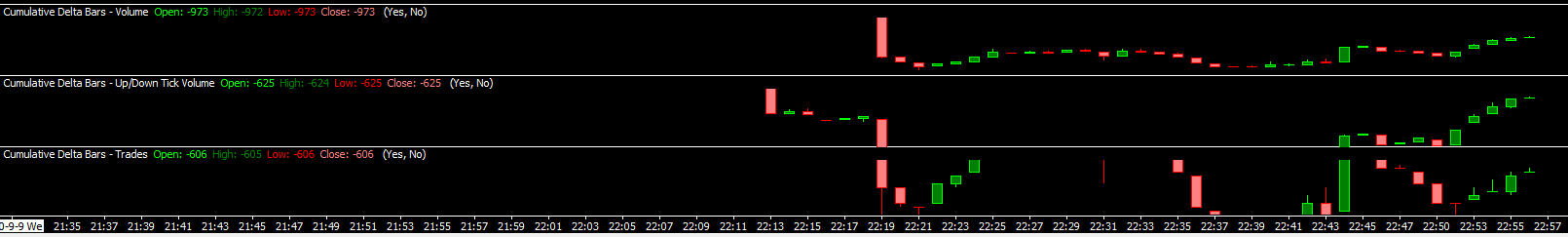 Yes, we have heard about this before. There is not anything we can do. It just has to do with the data feed from FXCM. Use the symbol ESU18 instead when using the Cumulative Delta Bars studies. This will be much more accurate. This is a futures contract symbol which you will need to periodically rollover. Sierra Chart Support - Engineering Level Your definitive source for support. Other responses are from users. Try to keep your questions brief and to the point. Be aware of support policy: https://www.sierrachart.com/index.php?l=PostingInformation.php#GeneralInformation For the most reliable, advanced, and zero cost futures order routing, *change* to the Teton service: Sierra Chart Teton Futures Order Routing Date Time Of Last Edit: 2018-07-23 18:50:42