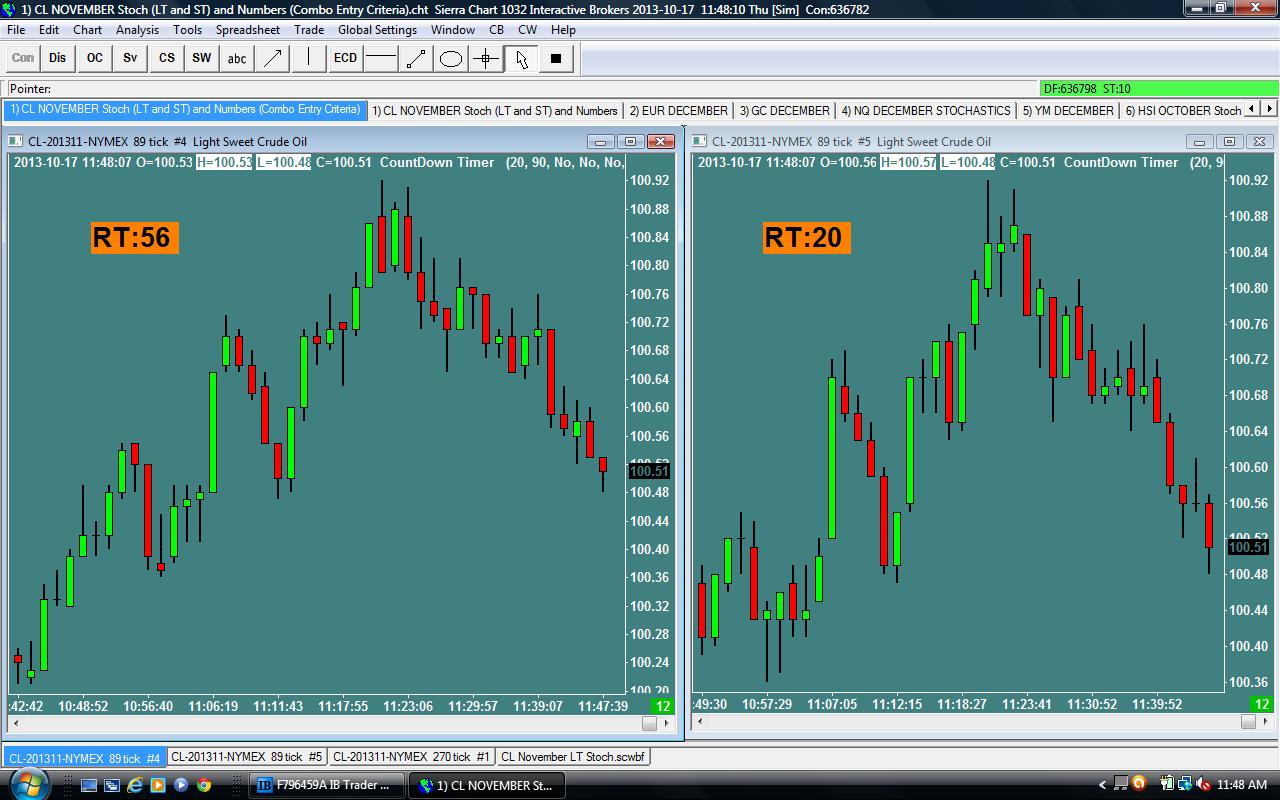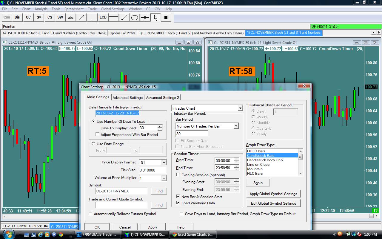 Please see the attached jpeg....it shows two exact same charts side by side....November Crude Oil. I have both charts set to 89 ticks. For some reason, the tracking of the total ticks in each bar is different between the two charts (see the "counter" on each chart). The charts are running live side by side...they should be exactly the same...but they are not. I saw the same thing on the Hang Seng October futures charts a couple days ago. How can I resolve this issue? I am running SC version 1032. Never seen this before within SC.