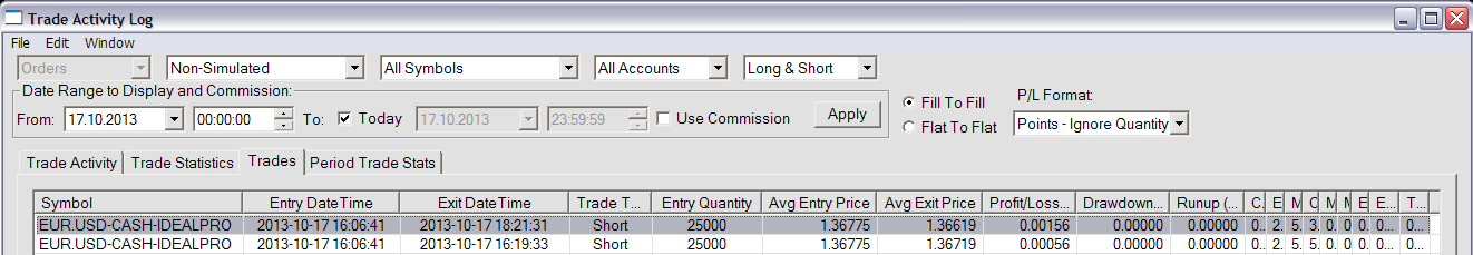 Why is in the Trade Activity Log, in the Trades tab nothing shown in the Drawdown and Runup columns? Even in the Trade Statistics fields Highest/Lowest Price During Positions there is nothing shown!? Broker: IB (live trading) Symbol: FX (EUR/USD) Please see the attached screenshot, TradesList.txt and TradeStatistics.txt Date Time Of Last Edit: 2013-10-18 09:16:04