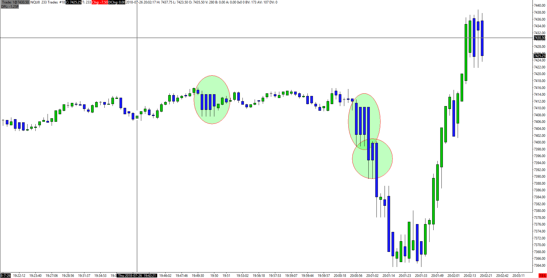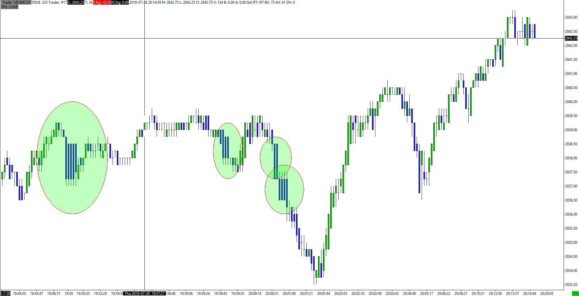 My ESU8 233-Trades chart prints funny multiple bars from time to time and it makes the chart hard to understand. Can you explain this to me and help me with a solution to eliminate this confusion? I am also including my NQU8 chart. I have indicated the problem areas with green ellipses on the charts. In most cases the first bar in the series has a time like 19:49:44 and the remaining bars all have time stamp 19:50:00. Or the first bar is time stamped 20:00:56 and the other bars are time stamped 20:01:00. These are not the only times these problems print, they are only examples from today. Note that I have four charts up: ES, NQ, RTY, and YM and they all seem to pause a second or two then all print a series of bars coincidentally. http://www.sierrachart.com/image.php?Image=1532670460653.png http://www.sierrachart.com/image.php?Image=1532670554738.png Thanks. Richard |