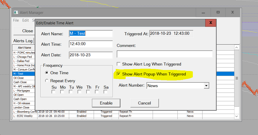 Alert Manager > Time Alerts I have several setup. The sound and the alert log are both working properly, but the Popup text box advising of the alert is not visible. Each alert has been setup with the option ticked for 'show alert popup when triggered' On v1785. I have had this working when running SC on another machine with a lower version number. Is there some reset function in case the alert window is positioned off screen as a result of copying the files from one machine to another where maybe the screen resolutions are different between the two setups? |