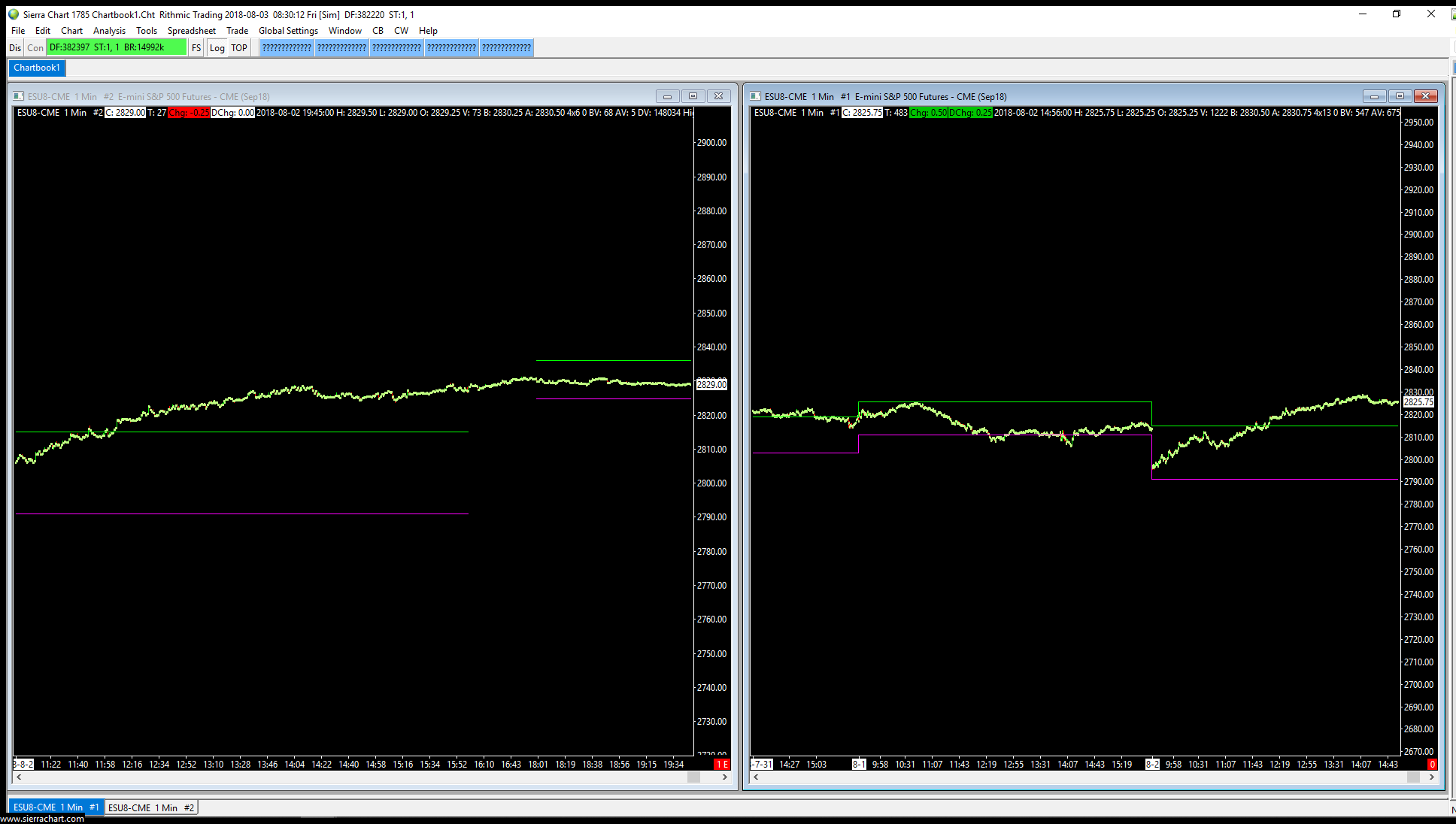 My BUST on the 14:00! I'm sorry. I meant 16:00 If I understand what you are asking... You are trying to get the Overnight High Low to display from one chart to another chart that is NOT showing the overnight session. Is this what you are trying to accomplish? http://www.sierrachart.com/image.php?Image=1533299413788.png The first chart (on the left) is the eMini S&P 500 1 minute with Use Evening Session checked The study is High/Low for Time Period - Extended Study Start time 18:00:00 End Time 09:29:59 Number of Days to calculate 120 Use Stop Line NO Line Stop Time 15:59:59 Display High Low Incrementally NO Input Data High High Input Data Low Low Friday Evening Extends into Sunday NO The second chart (on the right) is the eMini S&P 500 1 minute with Use Evening Session NOT checked The Study is Study/Price Overlay The only input I set was Study to Overlay I set that to ESU8-CME 1 Min #1 (The first chart) and High/Low for time period extended (The study) I think you can see the High Low for the evening session on the first chart are extended through the day session The second chart has those High Low lines displayed even though the chart is set to NOT use the evening session |