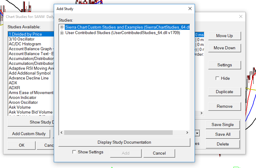 I'm guessing you're running the 64 bit version of SC but you compiled your study with the 32 bit version. You can tell because your .dll file does not have _64 as part of the name. Run the 32bit version of SC and see if your study shows up there. If it does, what I speculated above is accurate. -- Scott Date Time Of Last Edit: 2018-08-03 20:38:54