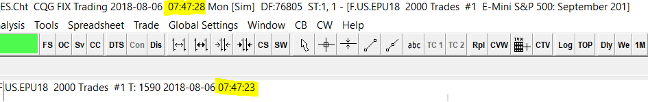 Hi, I updated to Sierra 1785 yesterday and today I noticed an issue occurring. The time in my active chart is lagging by anywhere from 5-20 seconds. e.g in the screenshot you will see I have highlighted the clock time in the main window and the time in my active chart window. Both are different. The time in the active chart window time seems to freeze and no new data is updated on the chart until it suddenly catches up with the main window time before the issue repeats. Only the time/data freezes, I can use the chart (draw/scroll etc) fine. Please advise as I cannot trade until the data is coming in in real time. Thanks Date Time Of Last Edit: 2018-08-06 13:25:08