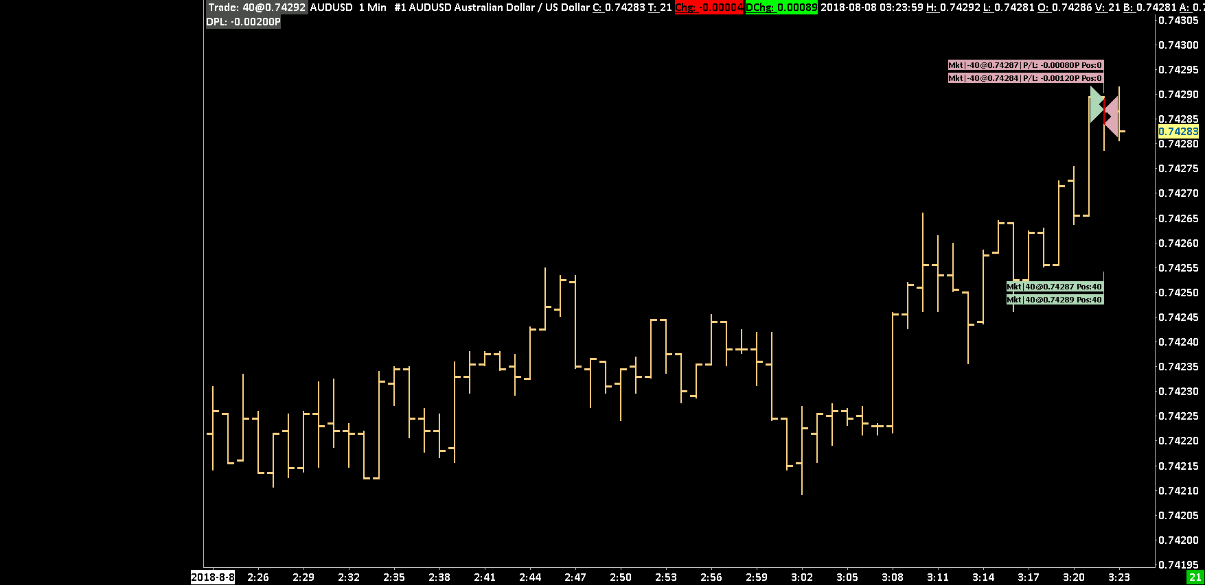 Hi, please have a look at my screenshot. With LMAX Demo, my limit orders get filled at a point far from the current price whether it's the take-profit on a position or the entry order. Is this a problem of LMAX because it's their demo account or of Sierra Chart? The entry and my manually initiated flattening of the position are marked with a green and a red arrow respectively. The green arrow is far away from the price. The trade should not have executed at the green arrow. My screenshot: http://www.sierrachart.com/image.php?Image=1533711297567.png Trade Activiy Log --> Trades tab: Symbol Trade Type Entry DateTime Exit DateTime Avg Entry Price Avg Exit Price Entry Quantity Exit Quantity Max Open Quantity Profit/Loss (C) Running P/L (C) Runup (C) Drawdown (C) Max Open Profit (C) Max Open Loss (C) Entry Efficiency Exit Efficiency Total Efficiency Commission (C) High Price While Open (C) Low Price While Open (C) Note AUDUSD Long 2018-08-08 08:40:14.084 2018-08-08 08:41:38.207 0.74175 0.74234 100 100 100 59.00 7.00 59.50 0.00 59.50 0.00 100.00% 99.16% 99.16% 0.00 0.74175 0.74175 Parent order |