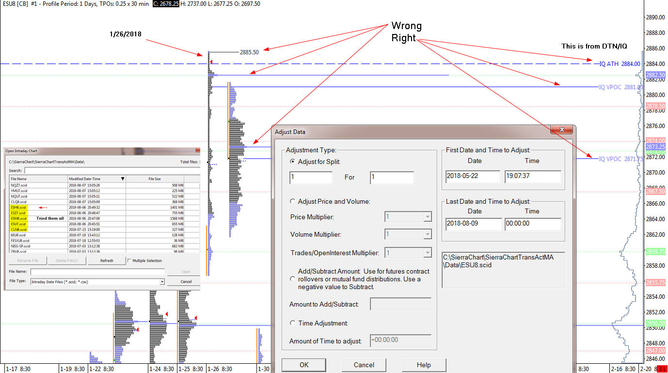 Hi, My data from 1/26/2018 shows a high of 2885.50 and it is suppose to be 2884.00. I tried to adjust the data for 1/26 and 1/29. It is a continuations future. I tried to open the file for that contract to no avail. How do I do that please. When I click on the file it opens a current chart only dated back to 5/2018 Thanks you Please see attached |
