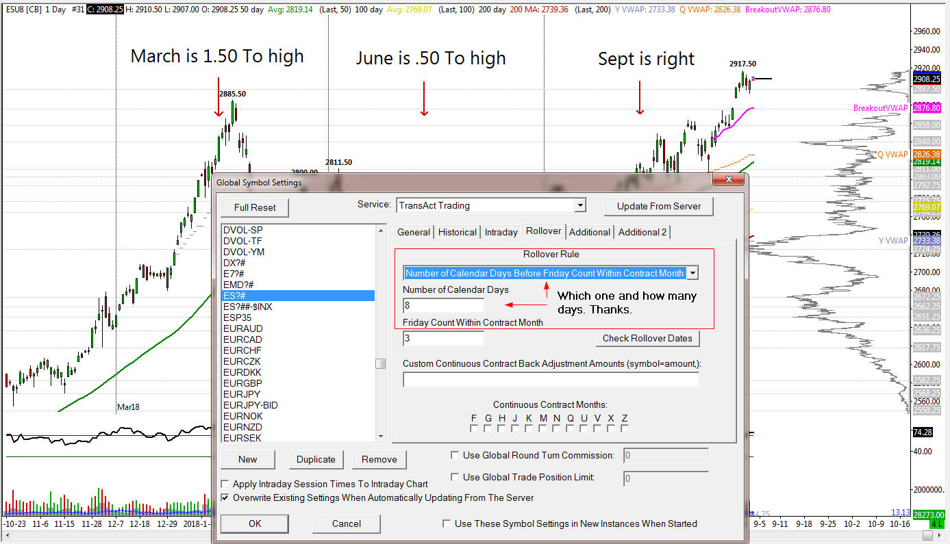 You need to read the documentation: Continuous Futures Contract Charts: Controlling Rollover Amount for Back Adjustments (Controlling Rollover Amount) Clearly you have not read it or you have looked at the wrong section. Maybe because your browser did not scroll to the right section. Sierra Chart Support - Engineering Level Your definitive source for support. Other responses are from users. Try to keep your questions brief and to the point. Be aware of support policy: https://www.sierrachart.com/index.php?l=PostingInformation.php#GeneralInformation For the most reliable, advanced, and zero cost futures order routing, *change* to the Teton service: Sierra Chart Teton Futures Order Routing Date Time Of Last Edit: 2018-09-03 22:11:56
