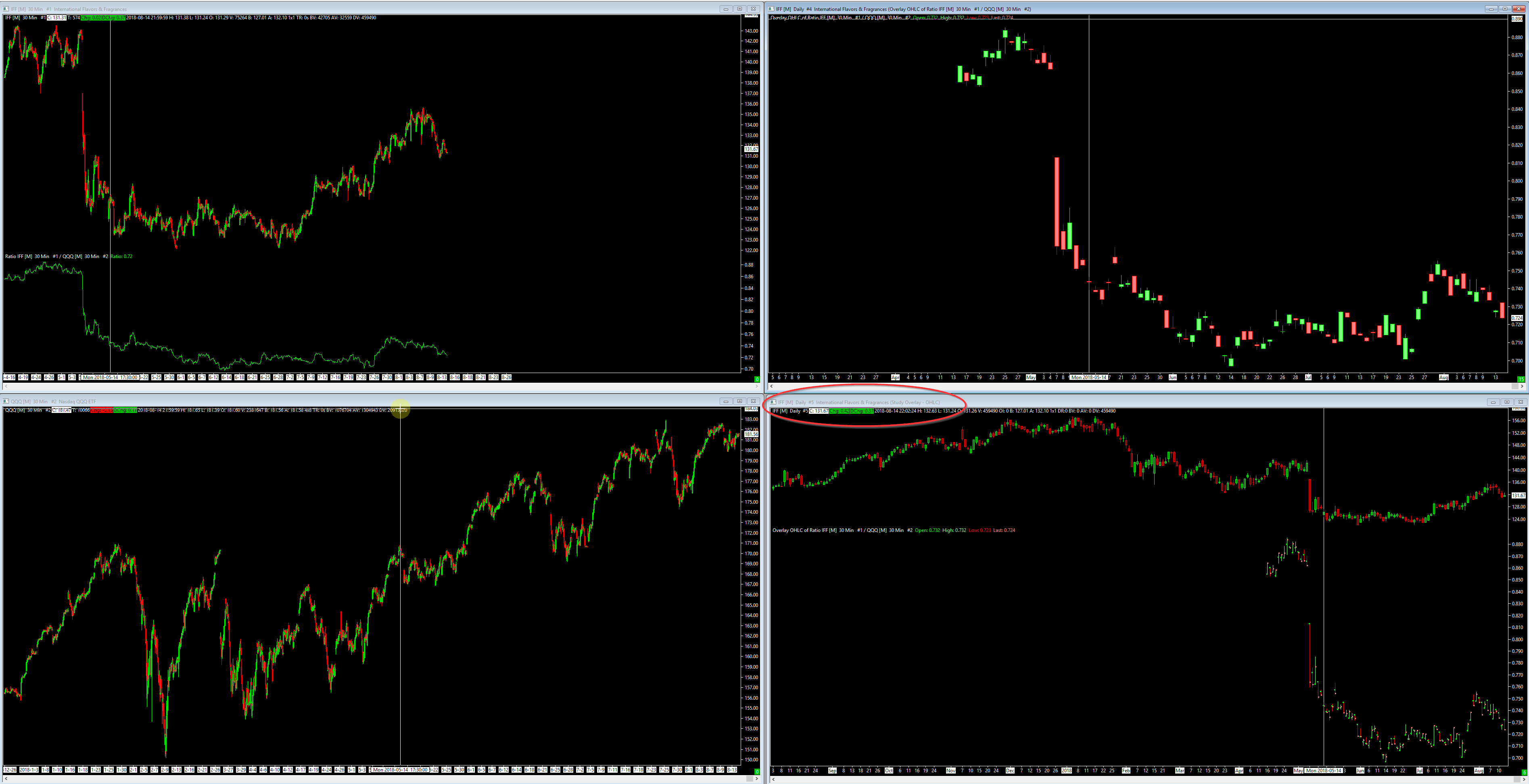 Example in chartbook. 1.) #1 chart with 60 M TimeFrame and history 90 Days 2.) #2 Chart with Daily Timefame and history 90 Days 3.) Add Study_Overlay_-_OHLC to #2 Chart 4.) In Study_Overlay_-_OHLC add as "Chart,Study, Subgraph reference " chart #1 (main Price Graph, Last) Now i can see only 21 Days supgraph . no matter i change #1 to 10 Sec and #2 to 5m , i get ~21 Days in supgraph only. Whats Wrong? You are trying to add a 60 min chart as an overlay to a daily chart. The daily chart has only one bar per day, overlaying a 60 min chart will only give you one bar per daily bar. Please explain what you are trying to do. |