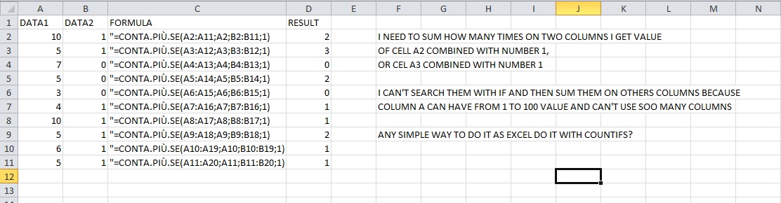 Hello, I'm trying to reproduce COUNTIFS excel function with spreadsheet. I need to reproduce this attached exemple. -------A--------B-------C 1---DATA1-----DATA2-----RESULT 2---10---------1----------2 3---5----------1----------3 4---7----------0----------0 5---5----------0----------2 6---3----------0----------0 7---4----------1----------1 8---10---------1----------1 9---5----------1----------2 10--6----------1----------1 11--5----------1----------1 *** I NEED TO SUM HOW MANY TIMES ON TWO COLUMNS I GET VALUE OF CELL A2 COMBINED WITH NUMBER 1, OR CEL A3 COMBINED WITH NUMBER 1 ... ... I CAN'T SEARCH THEM WITH IF AND THEN SUM THEM ON OTHERS COLUMNS BECAUSE COLUMN A CAN HAVE FROM 1 TO 100 VALUE AND CAN'T USE SOO MANY COLUMNS ANY SIMPLE WAY TO DO IT AS EXCEL DO IT WITH COUNTIFS? *** With old spreadsheet I get correct result with: =SUMPRODUCT((A2:A11 = A2) * (B2:B11 = 1)) but it's very CPU heavy for my computer. Thanks for the help. Regards Date Time Of Last Edit: 2018-08-17 16:46:24