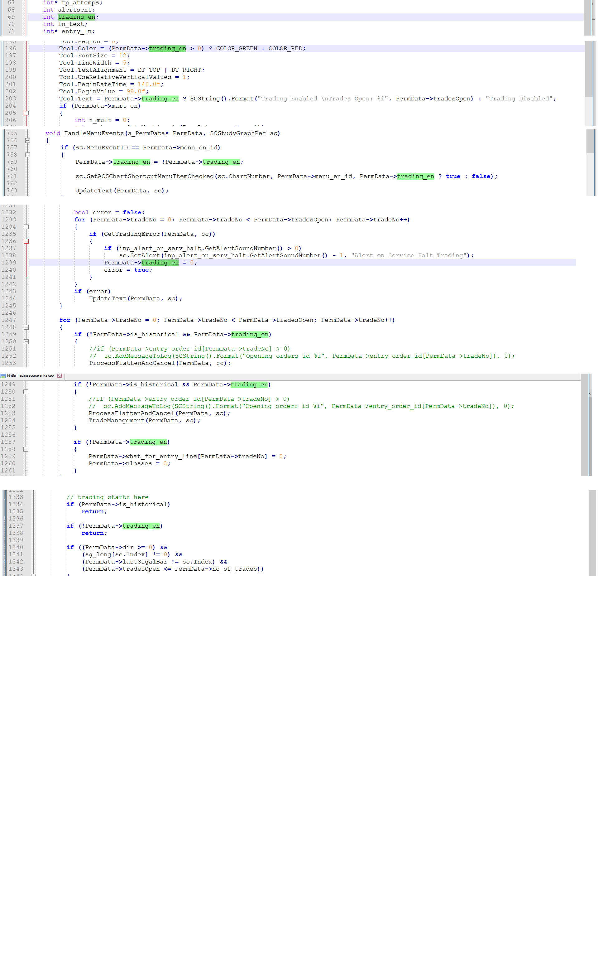 Many many thanks. i will leave the strategy running but will explain here what i am trying to do so maybe all you can help me further there something in this code wich disables trading everytime i get a error from the exchange i wish to remove it see the image, what i did now to test is simple delete line 1239 wich i believe is the part of code responsible for make the strategy turns off after receive a order rejection message do you believe this is what is disabling the strategy? delete only line 1239 is enough or should i delete all "traing_en" lines? thanks in advance |
