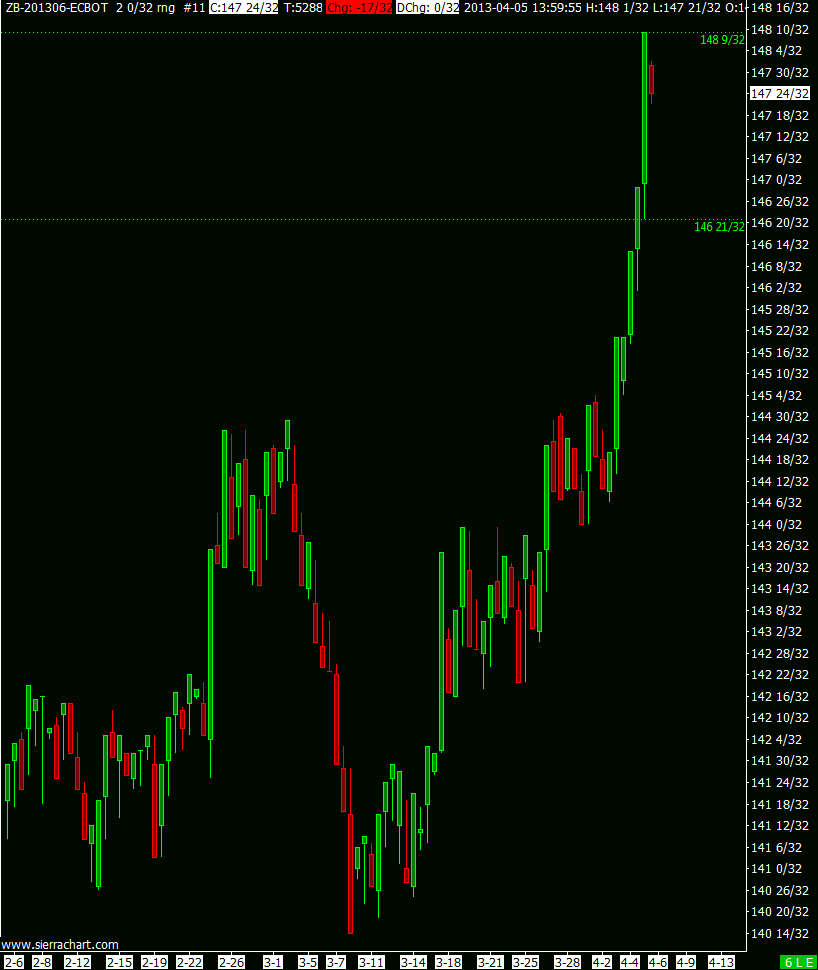 The futures contract is ZBM13. This is a 64 ticks range chart: http://www.sierrachart.com/image.php?l=136529869377.png This is a 94 ticks range chart: http://www.sierrachart.com/image.php?l=1365298732930.png You noticed the charts are IDENTICAL!? In fact, any settings larger than 50 ticks or so, the charts looks exactly the same as the 51 ticks range chart. What is going on or can this issue be fixed with the next update. Other futures contracts (e.g. GC, ES, CL, etc.) that I look at do NOT have this issue. Date Time Of Last Edit: 2013-04-07 01:46:38