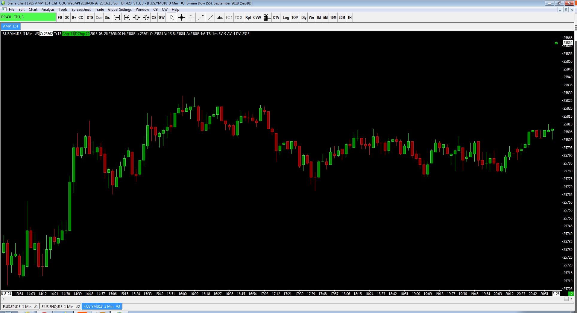 Hello I am getting gaps in data on my sierra charts using CQG data feed with AMP Futures. I have spoken to a tech at AMP Futures and they are also seeing the same issue on their end via sierracharts/CQG Also it seems to be only occurring with CME and CBOT but COMEX and NYMEX are working ok. Date Time Of Last Edit: 2018-08-27 00:03:31