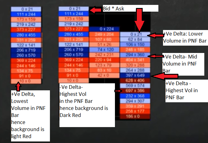 To clarify, you want to create a footprint using PNF bars and want to see Bid x Ask for the text and want the background to be shaded based on Bid/Ask volume difference (delta)? Just checking since you note that a bar has the highest volume so it should be dark blue, however you can't color the background based on total volume and delta, you have to pick one. Also, to color background in different shades with numbers bars, you are going to have to pick thresholds. Since I'm unsure what you consider high and low delta, I've just used +/- 200,500,1000. So any delta below 200 will be shaded light red/blue, anything above 200 up to 500 will be medium red/blue, anything above 500 dark red/blue See attached image. The chart book is attached. Take a look and see if that's what you're looking for. Date Time Of Last Edit: 2018-08-27 21:56:17