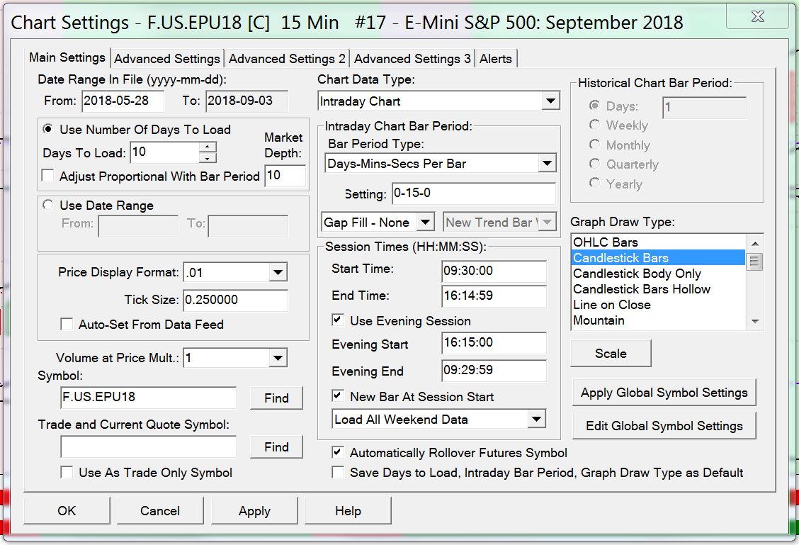 Good morning, I have followed these instructions including the optional one but it is still not placing correctly the candlesticks, 5, 15 minutes are good but 1, 2, 4 HRS not. Also read several other pages in web site but at time no go. The only symbol I trade is F.US.EPU18. Can you please look at (screen settings picture attached): Session Time (HH:MM:SS) Start Time 09:30:00 End Time: 16:14:59 Use Evening Evening 16:15:00 Evening End 09:29:59 New Bar At Session Start Thank You Regards |