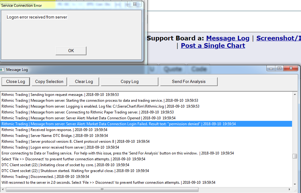 For help with the Rithmic permission denied error refer to: Rithmic Trading Platform Service: Permission Denied Resolution Procedure Sierra Chart Support - Engineering Level Your definitive source for support. Other responses are from users. Try to keep your questions brief and to the point. Be aware of support policy: https://www.sierrachart.com/index.php?l=PostingInformation.php#GeneralInformation For the most reliable, advanced, and zero cost futures order routing, *change* to the Teton service: Sierra Chart Teton Futures Order Routing Date Time Of Last Edit: 2018-09-10 18:28:15