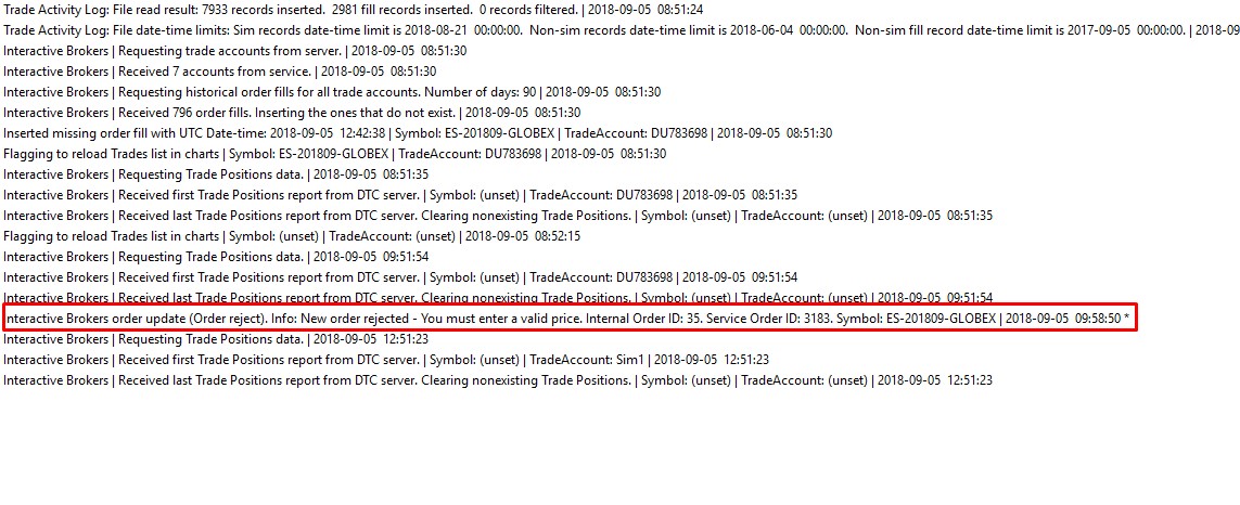 See screenshot of Trade Service log. Please note that I have 3 other DOMs opened and there are issues in submitting orders above the ASK or below the BID on these 3 DOMs. Only one DOM has this issue.