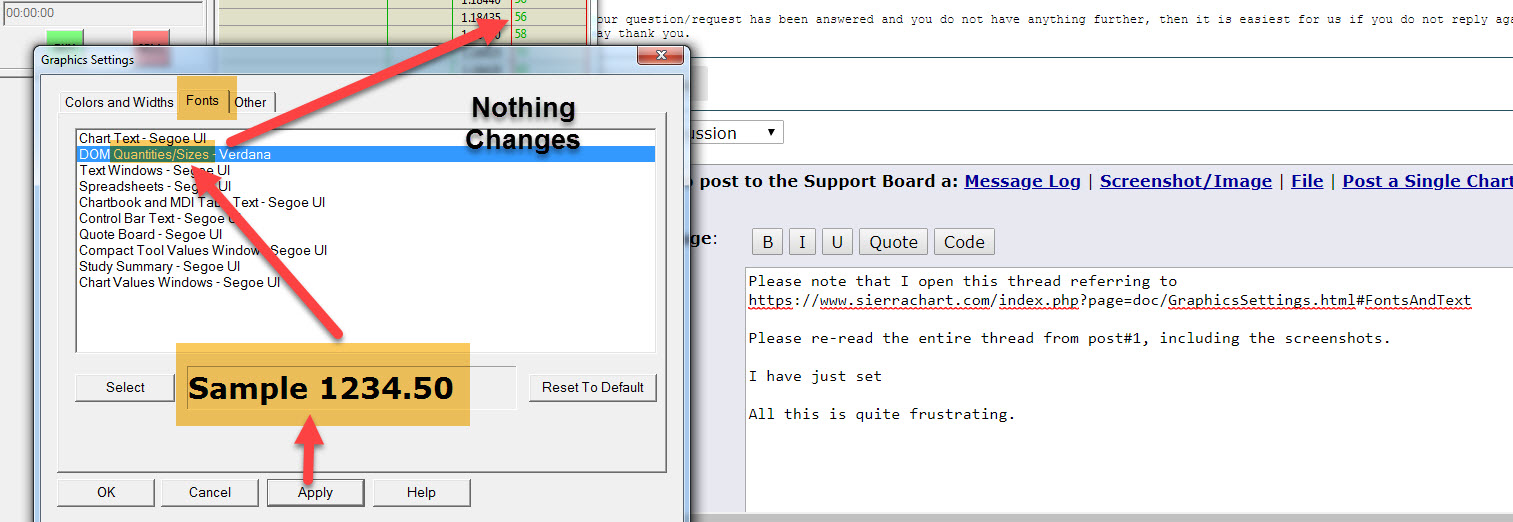 We apologize. This is a terrible mistake. The wrong link was given. We have corrected that above. Here is the correct link: Graphics Settings: Fonts and Text Appearance You will need to control the font size through: Chart >> Graphics Settings - Chart >> Fonts Sierra Chart Support - Engineering Level Your definitive source for support. Other responses are from users. Try to keep your questions brief and to the point. Be aware of support policy: https://www.sierrachart.com/index.php?l=PostingInformation.php#GeneralInformation For the most reliable, advanced, and zero cost futures order routing, *change* to the Teton service: Sierra Chart Teton Futures Order Routing |