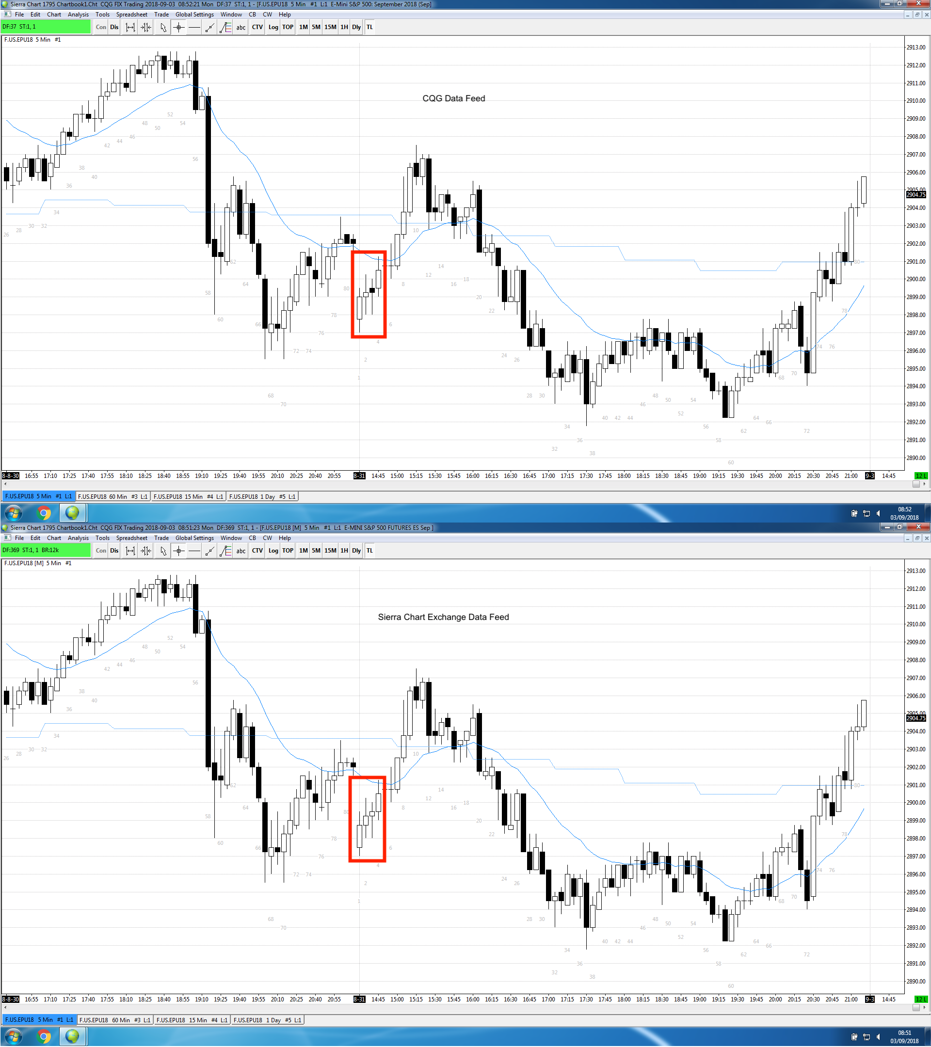 Happy to share my findings and would love some help understanding the root cause. I trade a 5m candlestick chart of the ES using CQG. After sharing screenshots of ES charts with other Emini traders (who use different data feeds), I started to notice small differences in our Opening and Closing prices of the 5 minute bars. As a point of reference, I checked the delayed charts on the CME website. They were indeed not the same as my CQG charts and they were matching the other trader's charts who were using Kinetick (DTN IQ Feed under the hood, I believe). I initially thought that this was an issue with my local Sierra Chart config. I therefore loaded the same chart in CQG Desktop (their cloud-based platform). The charts were identical to my Sierra CQG charts, therefore I ruled this out as the cause. I signed up for a trial of the Sierra Chart Exchange Data Feed, configured it, disconnected, reconnected, refreshed my charts and voila, I now had a chart which matched the CME and the other trader's charts exactly! To highlight the issue further, here are the details for the first 4 bars of RTH on the ES, Fri Aug 31st 2018. Where there are differences between the two datasets, I have noted them in brackets. Sierra Chart Exchange Data Feed Bar 1 O: 2897.50 H: 2899.50 L: 2897.00 C: 2898.75 V: 26717 #: 10082 Bar 2 O: 2898.75 H: 2900.25 L: 2898.00 C: 2899.25 V: 16149 #: 6606 Bar 3 O: 2899.25 H: 2900.00 L: 2898.00 C: 2899.50 V: 15188 #: 5543 Bar 4 O: 2899.50 H: 2901.25 L: 2899.00 C: 2900.50 V: 18629 #: 7855 CQG Bar 1 O: 2897.75 (+.25) H: 2899.50 L: 2897.00 C: 2890.00 (-.25) V: 26067 (-650) #: 9876 (-206) Bar 2 O: 2899.00 (+.25) H: 2900.25 L: 2898.00 C: 2899.25 V: 16149 #: 6606 Bar 3 O: 2899.50 (+.25) H: 2900.00 L: 2898.00 C: 2899.25 (-.25) V: 15202 (+14) #: 5546 (+3) Bar 4 O: 2899.50 H: 2901.25 L: 2899.00 C: 2900.50 V: 18613 (-16) #: 7850 (-5) There is an image attached to help visually show the differences too. As you can see these one tick Open/Close differences are all too common throughout the day. I would like to understand why the CQG data is different. I would have expected the only real difference between data feeds to be latency, reliability, historical error correction, amount of historical data provided etc. As an aside, I do not believe this issue is unique to the CQG data feed, I checked my records and I was also experiencing similar problems with my old data feed, Transact. My guess is that other feeds may experience similar issues too. |