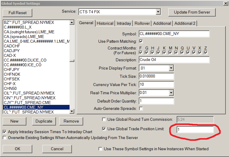 Really it is an impossibility it will not work for non-simulated trading. We verified that it does: Order Error - Order will cause Symbol Settings Position limit for symbol to be exceeded. Limit: 20. Internal Order ID: 3122. Service Order ID: (none). Symbol: EURUSD | 2018-09-14 14:42:50 * Is it enabled and what is the quantity? Sierra Chart Support - Engineering Level Your definitive source for support. Other responses are from users. Try to keep your questions brief and to the point. Be aware of support policy: https://www.sierrachart.com/index.php?l=PostingInformation.php#GeneralInformation For the most reliable, advanced, and zero cost futures order routing, *change* to the Teton service: Sierra Chart Teton Futures Order Routing |