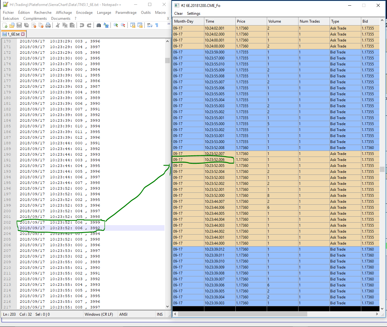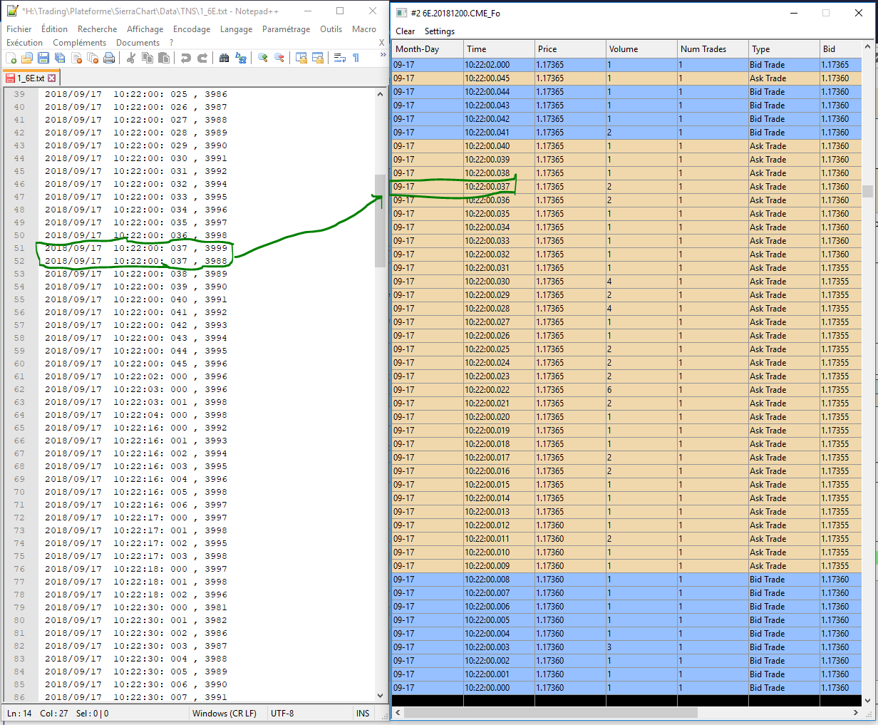 Thank you for your message. I made the corrections you told me. It works very well. But, when I compare the TNS of the file and that of the window. I still have the same problem. For some unknown reason, I have an additional line identical to the previous one in the test file. I put a picture. Is this normal? Is this an error of my code? #include "sierrachart.h" #include "scdatetime.h" #include "scstudyfunctions.h" #include <iterator> #include <iostream> #include <sstream> #include <fstream> #include <string> #include <chrono> #include <iomanip> #include <vector> #include <algorithm> #include <list> #include <cstddef> #include <cstdio> #include <cstdlib> #include <cmath> #include <ctime> SCDLLName("TNS_Modif"); SCSFExport scsf_TNS_Modif(SCStudyGraphRef sc) { SCInputRef OutputFile = sc.Input[0]; if(sc.SetDefaults){ sc.GraphName="TNS_Modif"; sc.StudyDescription="Time and sales"; sc.GraphRegion = 0; //sc.AutoLoop=true; sc.FreeDLL=1; OutputFile.Name = "The storage link"; SCString OutputFileDefaultName; OutputFileDefaultName.Format("H:\\Trading\\Plateforme\\SierraChart\\Data\\TNS\\1_%s.txt", sc.Symbol.GetSubString(2,0).GetChars()); OutputFile.SetString(OutputFileDefaultName); } std::ofstream file(OutputFile.GetString(), std::ios_base::app ); if (!file) { SCString Buffer; Buffer.Format("Unable to open file %s", OutputFile.GetString()); sc.AddMessageToLog(Buffer, 1); //return; } //Only do this processing on the last bar if (sc.Index == sc.ArraySize-1) { __int64& LastProcessedSequence = sc.GetPersistentInt64 (1); SCTimeAndSalesArray TimeSales; sc.GetTimeAndSales(TimeSales); if (TimeSales.Size() == 0) return; if (LastProcessedSequence != 0) { for (int TSIndex = 0; TSIndex < TimeSales.Size() ; ++TSIndex) { if(TimeSales[TSIndex].Sequence < LastProcessedSequence) continue; if (TimeSales[TSIndex].Type == SC_TS_BID || TimeSales[TSIndex].Type == SC_TS_ASK ) { int ValueFormat = sc.BaseGraphValueFormat; SCString formatString = " %i/%02i/%02i %02i:%02i:%02i: %03i , %i"; SCDateTime TradeDateTime = TimeSales[TSIndex].DateTime; TradeDateTime += sc.TimeScaleAdjustment; int Year, Month, Day, Hour, Minute, Second, MilliSecond; DATETIME_TO_YMDHMS_MS(TradeDateTime, Year, Month, Day, Hour, Minute, Second, MilliSecond); SCString BarDataString; BarDataString.Format(formatString,Year, Month, Day, Hour, Minute, Second, MilliSecond,TSIndex); file << BarDataString << std::endl; } } } LastProcessedSequence = TimeSales[TimeSales.Size()-1 ].Sequence; } } Date Time Of Last Edit: 2018-09-17 09:09:13