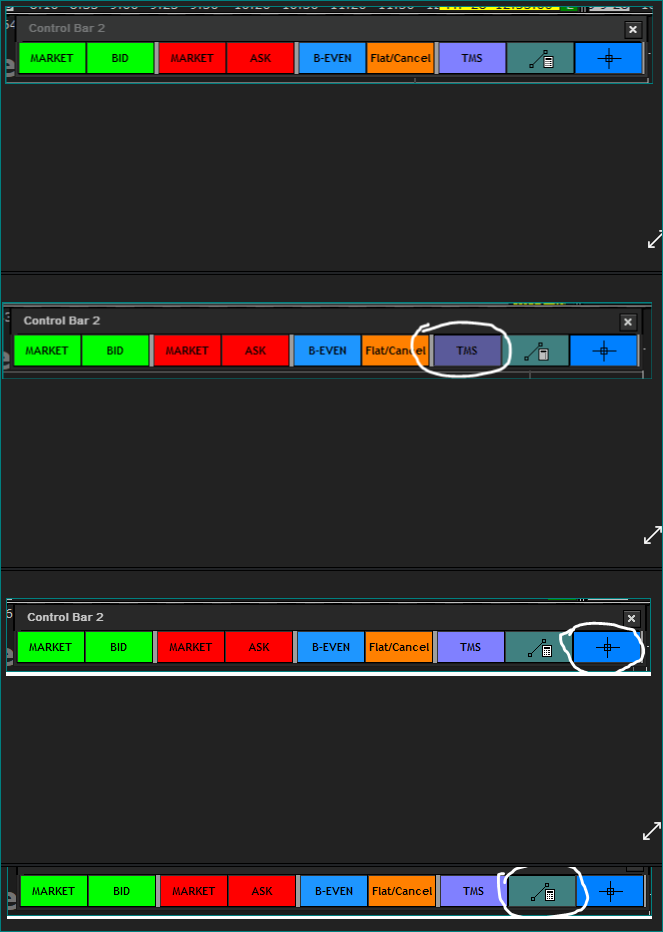 Here is one example of my floating accessory Control Bar. 1 - The top image is with no buttons selected and the colors are as expected. 2 - The 2nd bar from the top has the TMS (Trade Management Study) depressed and you can see it's shaded darker than the top button (as it should be) 3 - The 3rd bar I have the Cross Hair button depressed (this was one of the color affected buttons before the last fix) and it has no color change when selected 4 - The 4th bar I have the Calculator Tool selected, (this was also one of the color affected buttons) and it displays no color shift either. I have over a dozen other examples of buttons that were not showing the proper colors that now exhibit no change in state from active or inactive. If there's a border change, it's imperceptible to me. These images are from a 2k Monitor, I tried it on a 1080p monitor also and still can't see a visible change. Thanks --Scott Date Time Of Last Edit: 2018-09-28 16:59:26