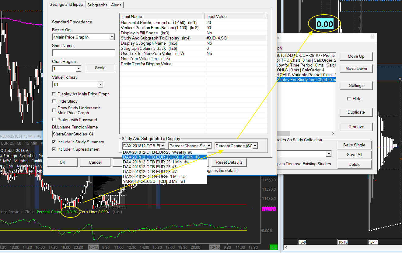 Because I'm not getting closer to this I just tested to display the actual % change from prev close as text on my chart and thought I put the "Prev Close from prev Close" study to my chart (hidden) and use the "Text Display For Study from Chart" study to get the SG1 value from the hidden indicator. But all I get is 0.00 as text and not the actual % change value?! I made a screenshot.... Date Time Of Last Edit: 2018-10-16 10:01:36