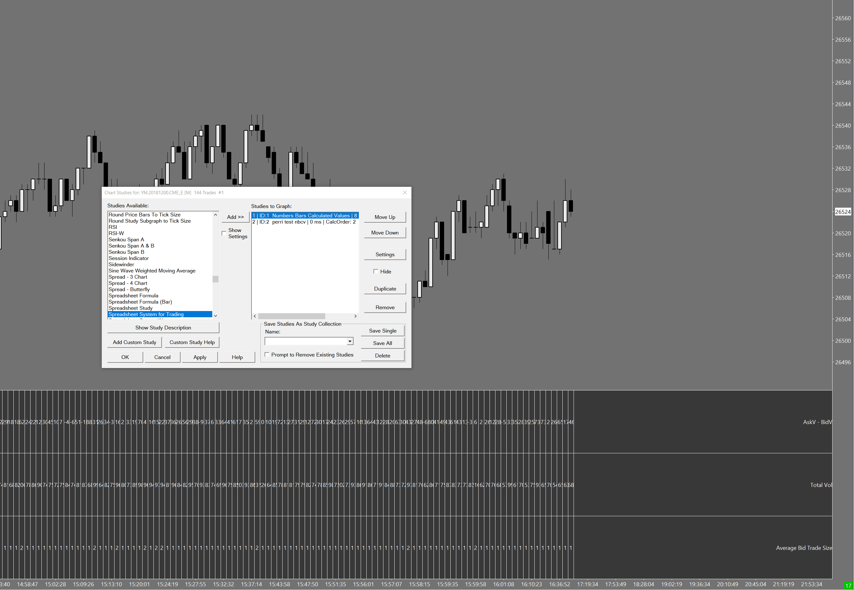 Hi, Currently have a chart with Numbers Bars Calculated Value(ID 1) attached with 4 subgraphs visible. When i then attach a Spreadsheet for trading study, i do not see id:1 (NBCV) in the expected AA column. Not sure why as i have previously used the NBCV study within spreadsheets. Perhaps there is a new setting? Any insight would be appreciated. Thanks |
