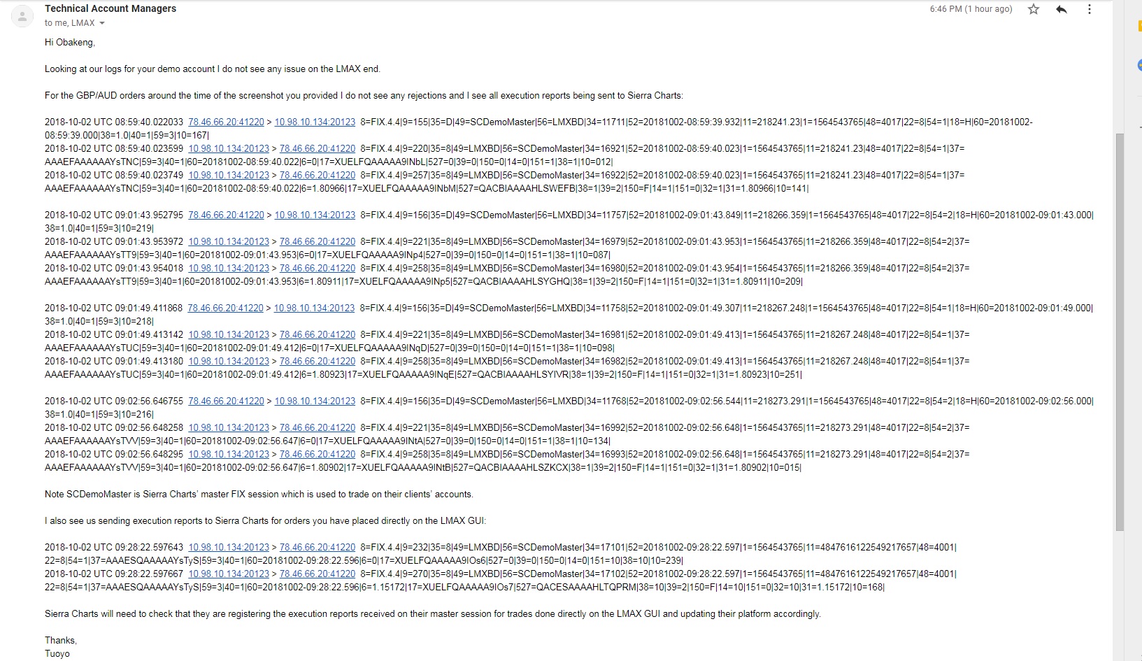 Is this the reason why actions taken on LMAX do not get transmitted to Sierra? What reason is this? We do not know what you are referring to. The only logical reason we can think of is that you are looking at different account numbers through the LMAX web trading as compared to Sierra Chart. We are going to run a test ourselves later today and see what we determine. We also have never heard of an issue like this with Live LMAX trading. Or actually even demo trading other than this. Sierra Chart Support - Engineering Level Your definitive source for support. Other responses are from users. Try to keep your questions brief and to the point. Be aware of support policy: https://www.sierrachart.com/index.php?l=PostingInformation.php#GeneralInformation For the most reliable, advanced, and zero cost futures order routing, *change* to the Teton service: Sierra Chart Teton Futures Order Routing Date Time Of Last Edit: 2018-10-03 08:14:23