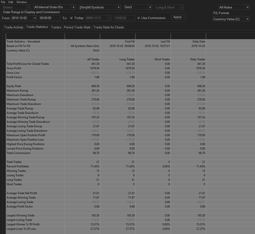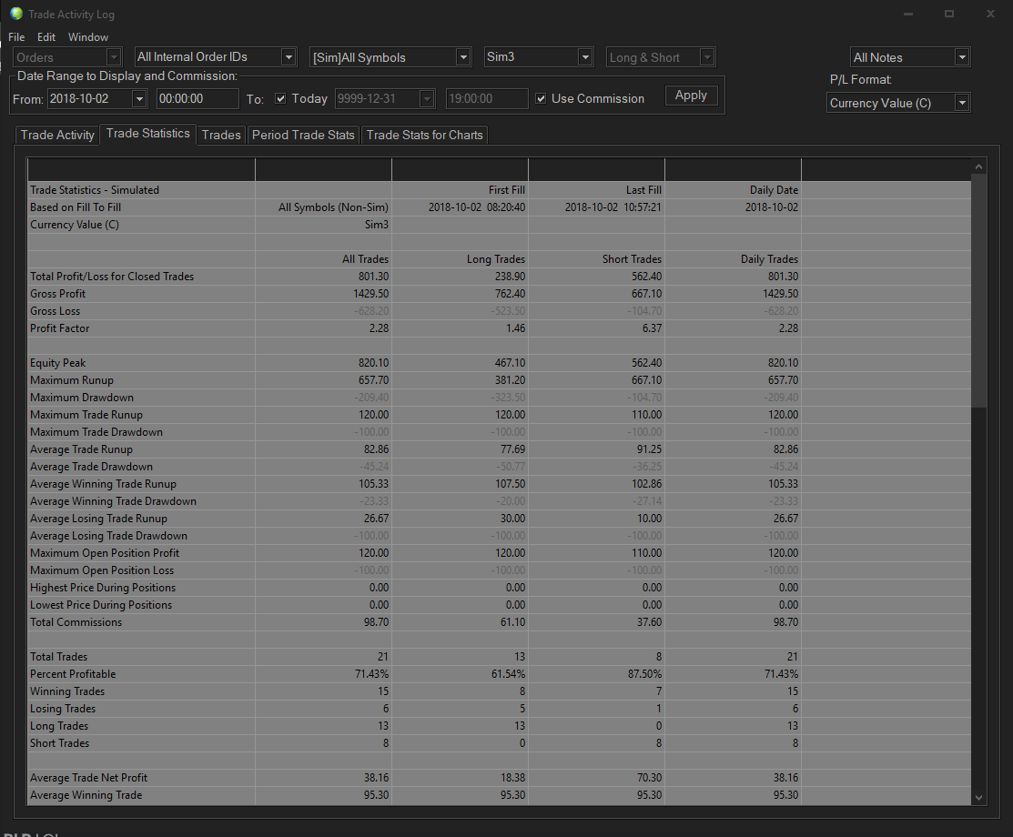 Wanted to check whether the statistics updating has been completed in the current prerelease. Yes the work has been completed in both the main release and prerelease.At the moment I note that both the export and import functions inside the Trade Activity Log are grayed out for me and cannot be used. Sierra Chart Support - Engineering Level Your definitive source for support. Other responses are from users. Try to keep your questions brief and to the point. Be aware of support policy: https://www.sierrachart.com/index.php?l=PostingInformation.php#GeneralInformation For the most reliable, advanced, and zero cost futures order routing, *change* to the Teton service: Sierra Chart Teton Futures Order Routing Date Time Of Last Edit: 2018-10-03 08:43:58