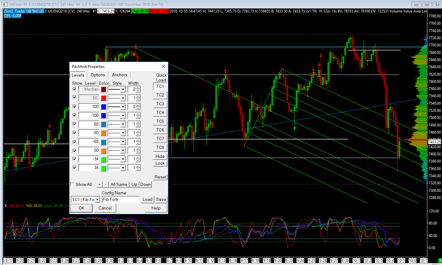 Hello, since I upgraded to 1815 all the pitchforks on all my charts are now a single color. It is always the last color in the list of lines that you have entered in the options box. All of the colors of the lines in the options box that were set are all still there and correct, but all lines are set to the last color. I have backed up to previous version of the software, but that now makes no difference. Attached is a png file that shows what is set and the single Color PF that has these setting with only the last color showing. |