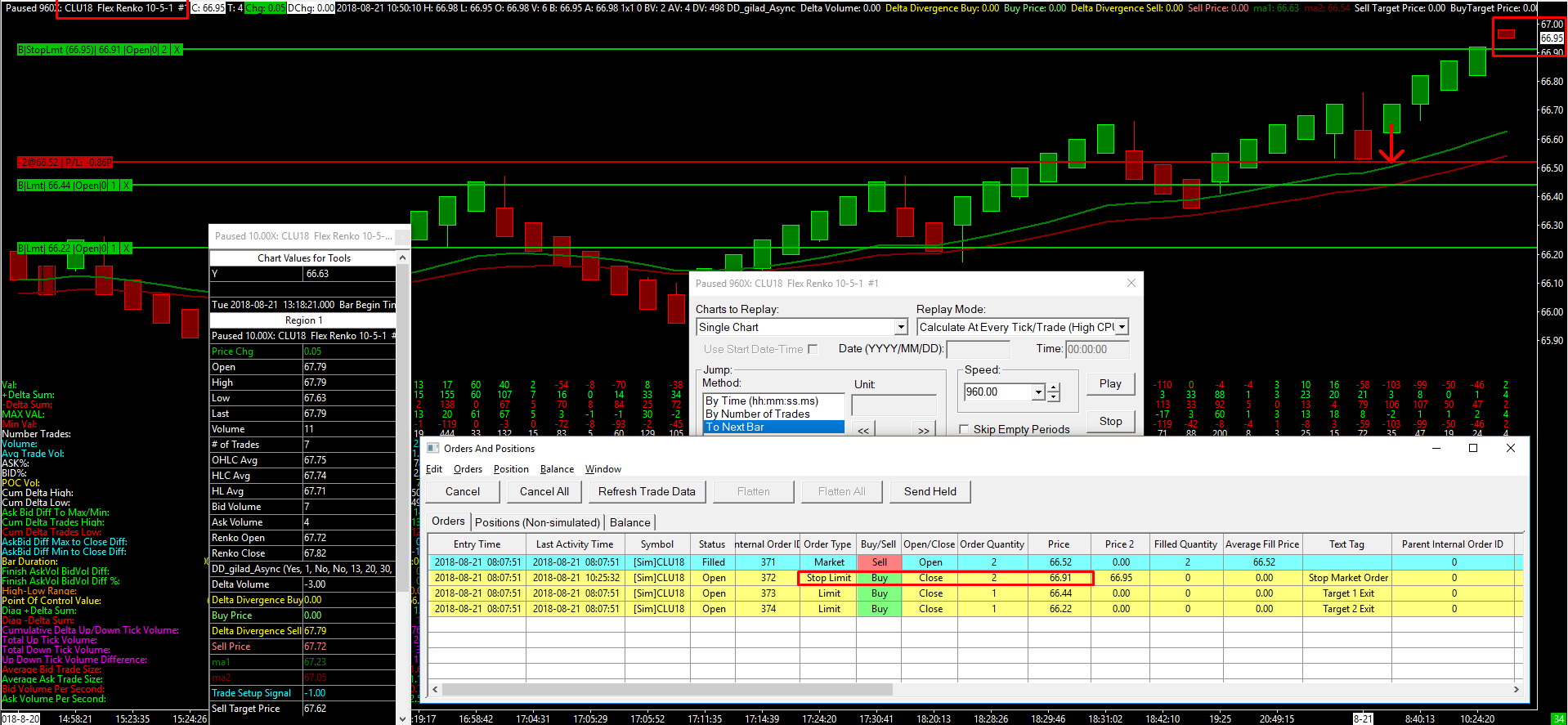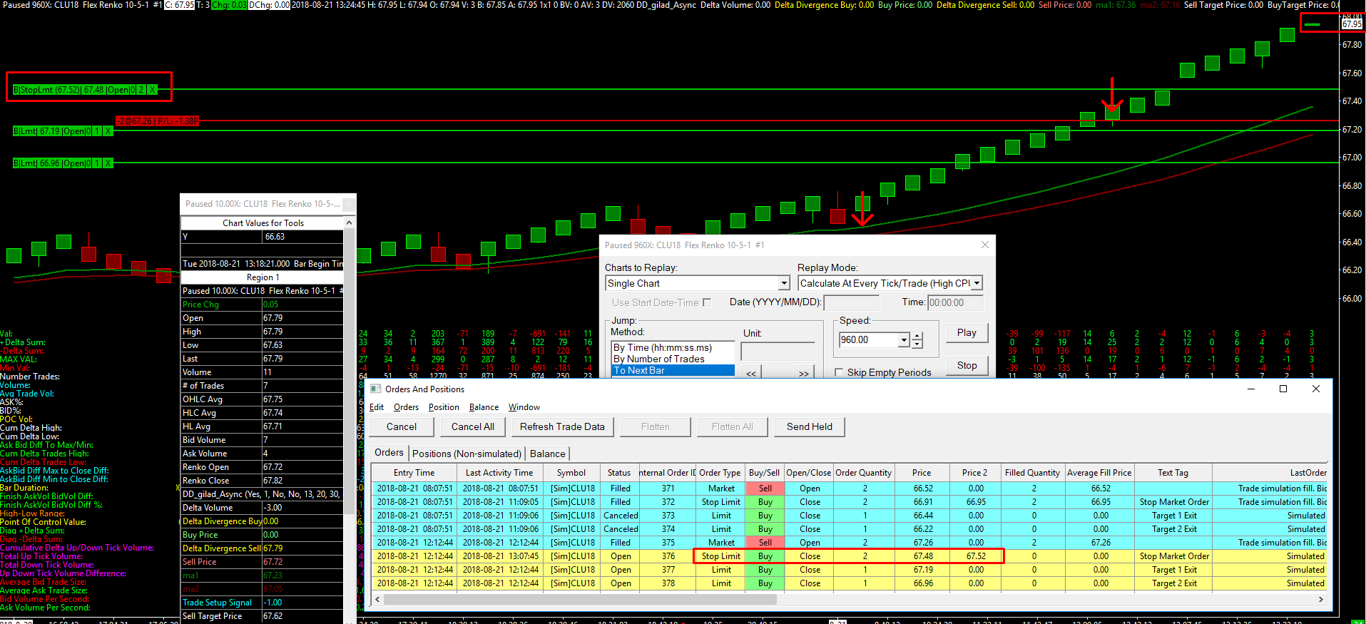 For information about all of this, refer to: Trade Simulation: How Orders are Filled Also you are using Stop-Limit orders. 3. when entering later a long trade, the entry price (68.07) has nothing to do with the actual price at the time/bar of the entry marked (~67.44) Not sure this will make any difference but make sure you are running the current version of Sierra Chart. Update following these instructions here: Software Download: Fast Update Sierra Chart Support - Engineering Level Your definitive source for support. Other responses are from users. Try to keep your questions brief and to the point. Be aware of support policy: https://www.sierrachart.com/index.php?l=PostingInformation.php#GeneralInformation For the most reliable, advanced, and zero cost futures order routing, *change* to the Teton service: Sierra Chart Teton Futures Order Routing Date Time Of Last Edit: 2018-10-08 18:05:17