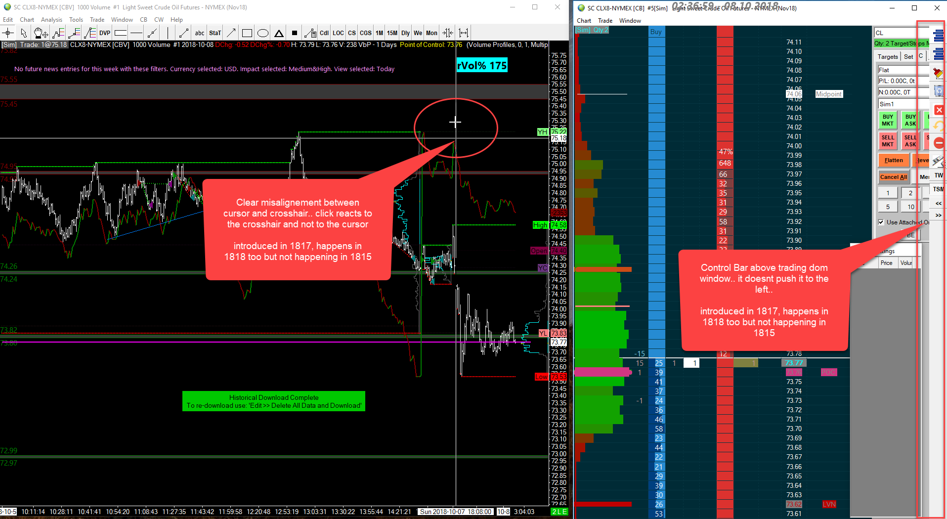Hello SC, - cursor and crosshair are misaligned and it reacts to clicks at the wrong spot - controlbar overlays chart / dom window see screenshot |
