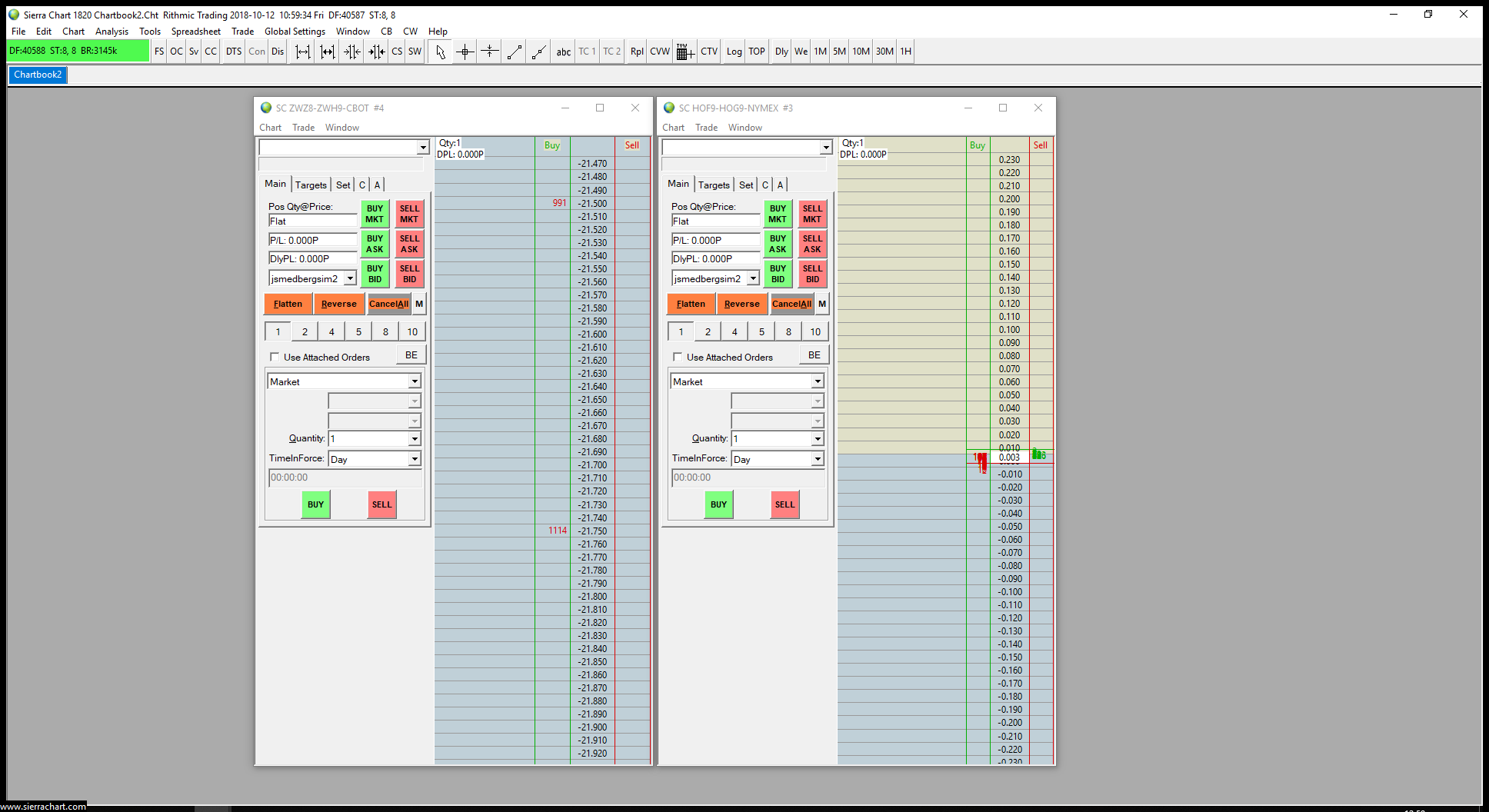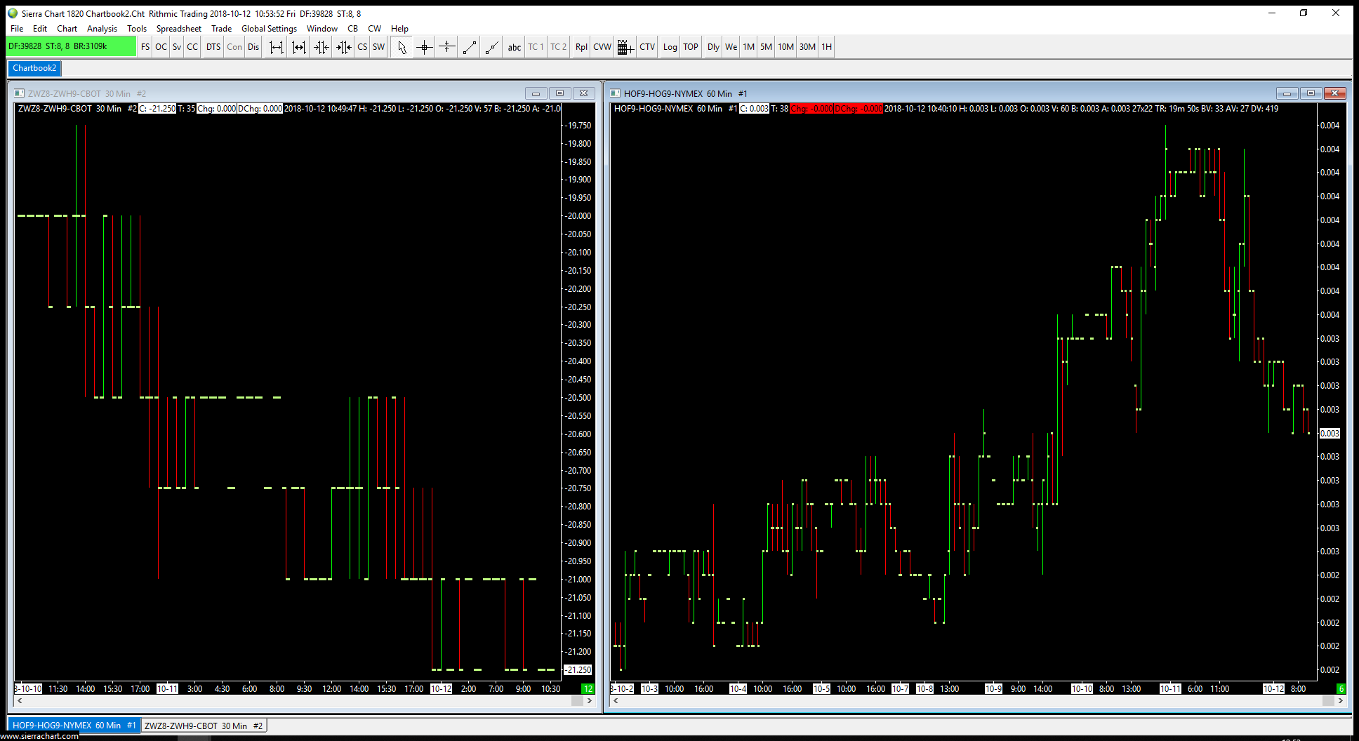 Hi I have a problem with charts and the DOM on exchange traded spreads, maybe it's just a setting i do not know about though. I have posted link with images of the problem that i have. On HOF9-HOG9-NYMEX i can't see correct prices on chart (it's 0.003 even if price moved up/down a few ticks). And in the DOM the order depth is clunked together. On ZWZ8-ZWH9-CBOT the chart prices have extra prices between ticks but otherwise it looks correct. In the DOM there are extra prices also so the order depth is spaced out. http://www.sierrachart.com/image.php?Image=1539341634794.png http://www.sierrachart.com/image.php?Image=1539341976786.png Best regards, Js |