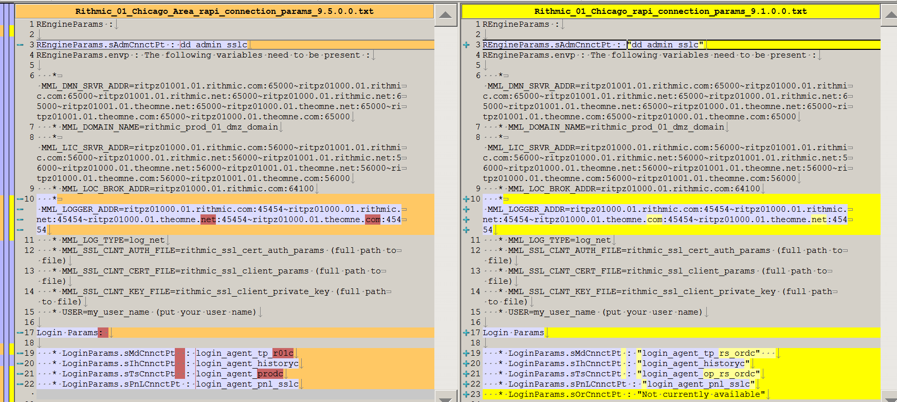 For an understanding of the connection parameters difference between what Rithmic says Sierra Chart should be using and what Sierra Chart is currently using, see the attached screenshot. What Sierra Chart is using is on the right side. You can see they are minor and effectively there is no difference in the domain names. Whatever the connectivity issue today was, we would think Rithmic would be able to resolve this from their side understanding the connection parameters being used. For a reason why we cannot update the settings, refer to: Rithmic Data Connection Failure | Post: 149895 One thing we can potentially do is rollback the code for the Rithmic bridge program to an earlier state when there apparently was not a problem and build and release that but we are not comfortable with that with all of the code updates we have done since then. And then we would have trouble using an earlier version of Visual C++ most likely. What we tried right now is doing a release build of the Rithmic bridge and tested the execution of it. It seems to run fine but being we see unstable behavior in the debug build we are not totally sure about releasing it but we will go ahead and do that. It will be in the next release. Sierra Chart Support - Engineering Level Your definitive source for support. Other responses are from users. Try to keep your questions brief and to the point. Be aware of support policy: https://www.sierrachart.com/index.php?l=PostingInformation.php#GeneralInformation For the most reliable, advanced, and zero cost futures order routing, *change* to the Teton service: Sierra Chart Teton Futures Order Routing Date Time Of Last Edit: 2018-10-13 03:22:34