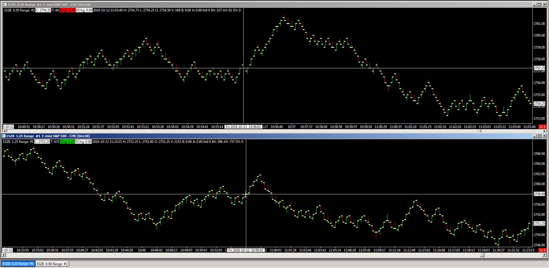 Hello I have a chart ESZ8 with Range bars (Range per bar - Standard in Ticks), 5 ticks per bar. I have duplicated it and set 2 ticks per bar on the second chart. Now at the same time point two charts show quite different closing prices. For example a 2-tick chart at 10:56:02 shows 2757.25 and a 5-tick chart at 10:56:02 shows 2758.00 Is it OK? It is a little misleading. How can I avoid it? Thank you. |