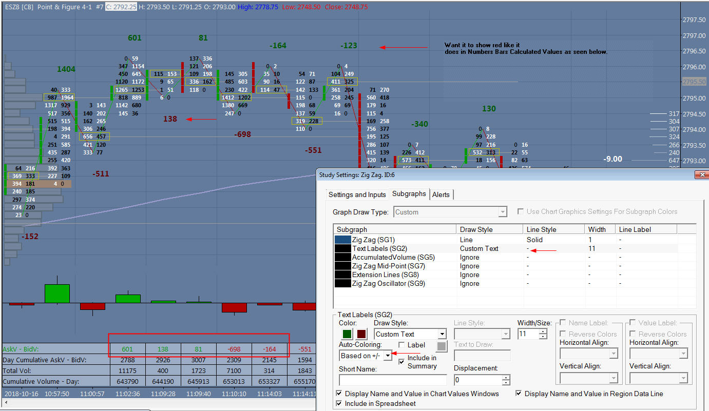 Hi, I want the values to paint red or green on ZigZag like it does for the Calculated Bars study. (Screenshot enclosed) I have set to do it to no avail. Am I am doing something wrong? Thanks as always. |