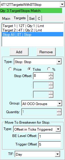 I am attempting to setup Attached Orders through the Trade Window. Currently, the issue remains with the following attached orders setup (screenshots provided - should be in order of reference): Working correctly - Two targets w/ common stop. The targets are in separate OCO groups (1&2) and the Stop is set to ALL OCO Groups. This configuration is saved using a total of 2 contracts and works fine. Stop Quantity = 2, Target 1 Quantity = 1 and Target 2 Quantity = 1. See attached screenshot. This saved configuration even works when I change the Total Quantity to three (3) - see attached screenshot. NOT Working as I Need it To - When I change the Total Quantity of contracts (ES) to something other than 2 or 3, the target totals are not what I want (remember, I want my runner quantity to stay at 1, no matter the number of contracts traded - unless I manually change it once in a trade). See last two screenshots. I suspect the answer has been observed by someone before with a relatively easy fix. I am sure this can be accomplished. I appreciate your time and efforts! |