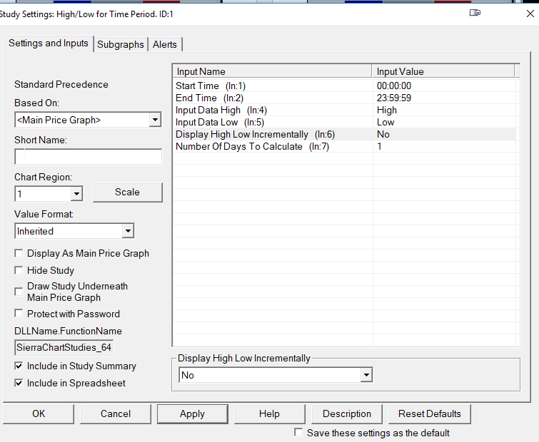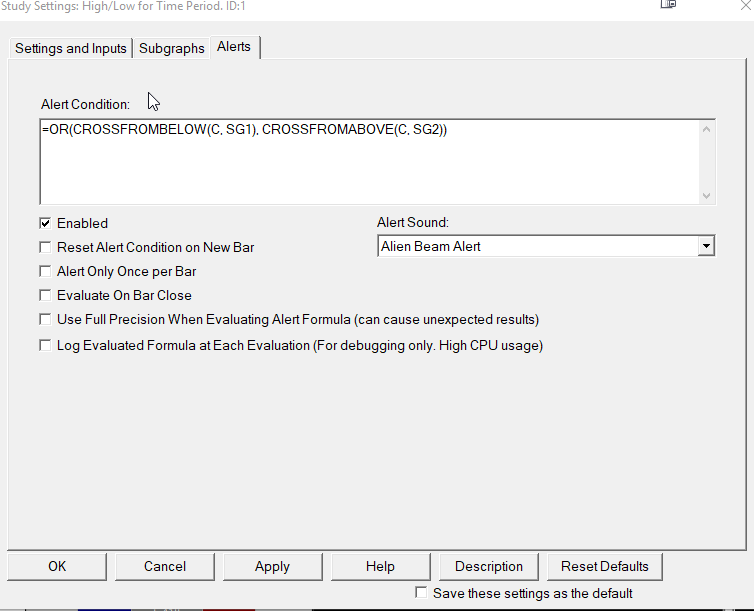 What you are trying to do will not work in this case, because, as you state, the High/Low will keep adjusting, therefore the Closing price never actually crosses over the High/Low. It sounds like you are wanting to be notified if there is a new High or Low reached on the current bar. If this is the case, then refer to the following study: New Daily High/Low Alert Sierra Chart Support - Engineering Level Your definitive source for support. Other responses are from users. Try to keep your questions brief and to the point. Be aware of support policy: https://www.sierrachart.com/index.php?l=PostingInformation.php#GeneralInformation For the most reliable, advanced, and zero cost futures order routing, *change* to the Teton service: Sierra Chart Teton Futures Order Routing |