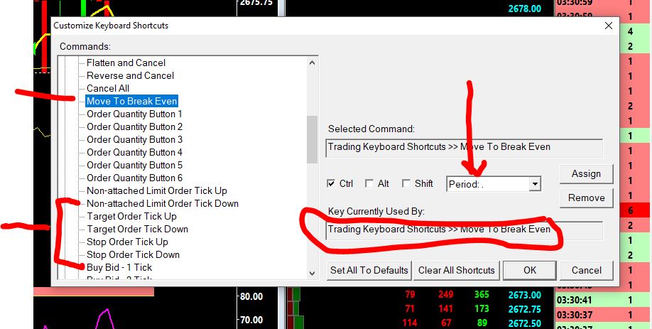 You locked the original thread, so I must submit a new ticket. See attached photo for how I have 'Move to BreakEven' keyboard short cut assigned. You stated in the last post of the locked thread that break even works on only attached orders. This only true for the [BE] button on the trade menu, NOT keyboard shortcuts. Keyboard shortcut DO move either/both a limit and stop, either manually placed, or attached, if you need a video of this happening I can post it. The problem is the Target & Stop tick up & Down attached orders do not function on non-attached orders. There is no error message in the log, they only work on attached-orders. Mark |