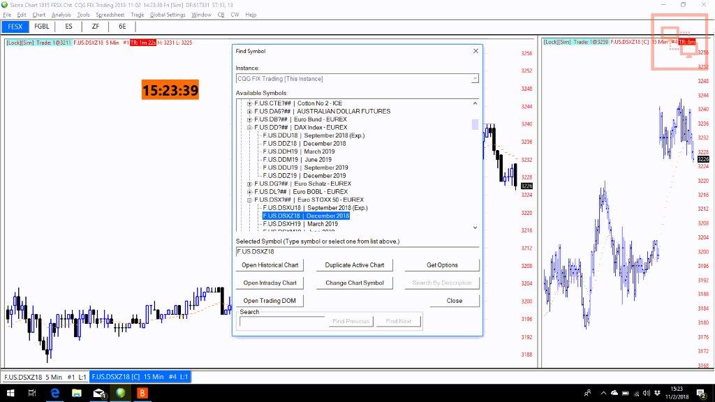 CQG WebAPI | Received symbol resolution report for symbol F.US.DDZ18. Search Symbol: F.US.DDZ18. Request ID: 94272. Contract ID: 730. | 2018-11-06 18:46:25 CQG WebAPI | Sent symbols for underlying request with ID: 94273 | 2018-11-06 18:46:25 CQG WebAPI | Adding 0 option symbols to Find Symbol window. | 2018-11-06 18:46:25 However, there are no options returned by the CQG system. We do not know why. Sierra Chart Support - Engineering Level Your definitive source for support. Other responses are from users. Try to keep your questions brief and to the point. Be aware of support policy: https://www.sierrachart.com/index.php?l=PostingInformation.php#GeneralInformation For the most reliable, advanced, and zero cost futures order routing, *change* to the Teton service: Sierra Chart Teton Futures Order Routing |