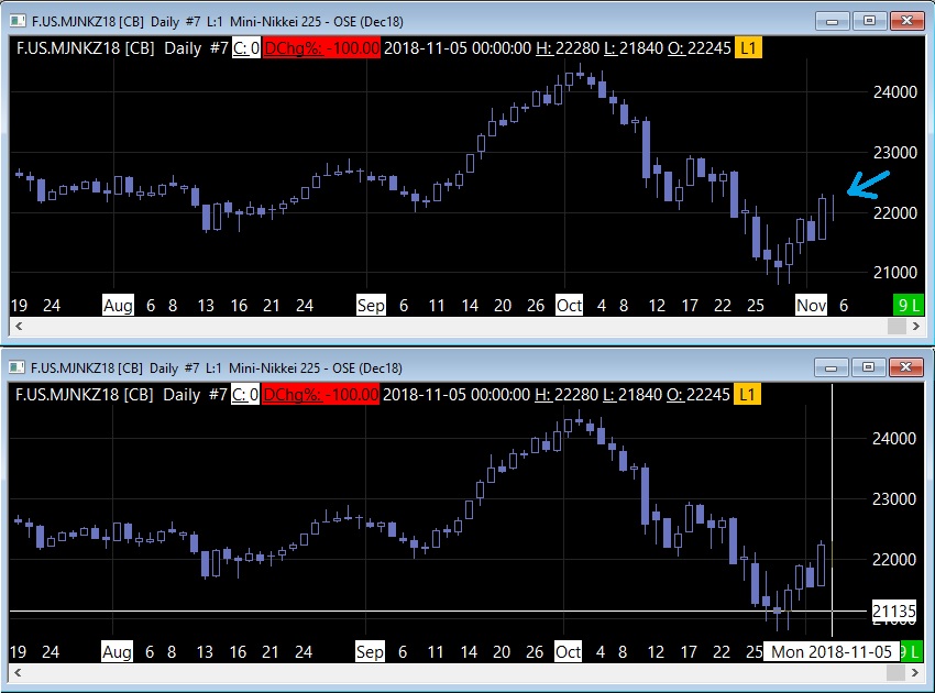 Hello! I'm having problem with one of my daily charts - Mini Nikkei futures. The last day in the chart is shown as a vertical line one day in the future. Even if this is normal, considering the time zone of the exchange, the problem is that this last day is shown as a vertical line and not as a candle. Please see the screenshot. Thanks! |