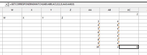 Dear SC, I'm trying to use =GETCORRESPONDINGMATCH() function to works with following example. My data are as in the attached image. My function is: =GETCORRESPONDINGMATCH(AB3:AB9,AC1,0,1,0,AA3:AA9,0)