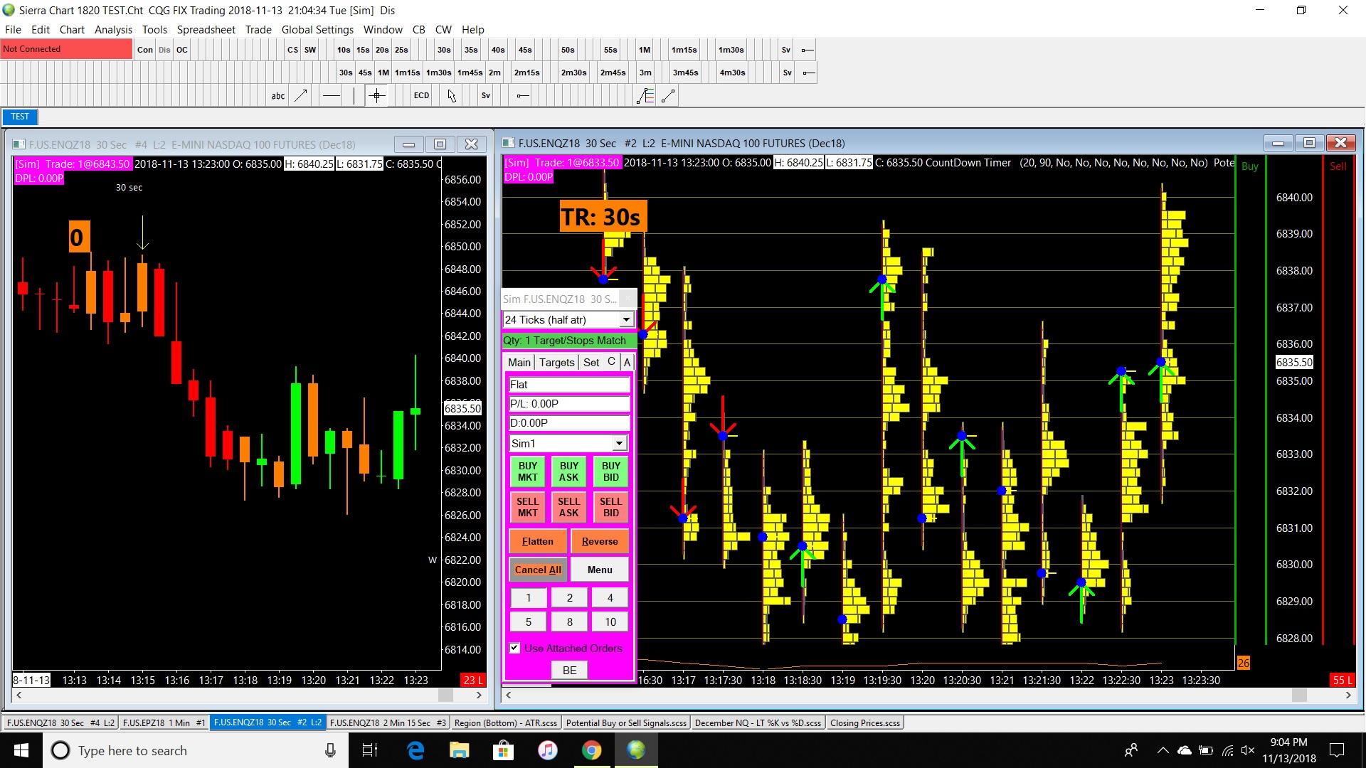 I am currently day trading the NQ using charts with small time frames (anywhere from 10 second bars to 1 minute bars). My current approach is to enter at the bar closing price with a one click limit order via the DOM (using the attached orders window so that an attached target and stop orders are submitted if I am filled with my entry)...see attached image. I use one mouse right-click in the DOM to enter the order. However, the prices dance around quite a bit which makes it hard to use my hand/mouse to enter the order via the DOM exactly at the closing price...I sometimes get filled above or below the bar closing price, or not at all if the prices are moving very fast. I have tried various techniques to help (such as changing the scale settings of the DOM to keep the price in one spot and let the chart bars dance around, or using the Buy Bid button on the Trade Window, etc. etc.). However, nothing really helps. Is there a way that I can have a command to enter a limit order at the bar closing price? For example, with 5 seconds to go until the bar is complete I determine that I want to enter a buy limit order at the bar closing price (with attached target and stop orders)....can I set up a command/key stroke to accomplish this (or some other method which doesn't rely upon my hand/eye coordination with the mouse to enter the order manually exactly when the bar closes)? |
