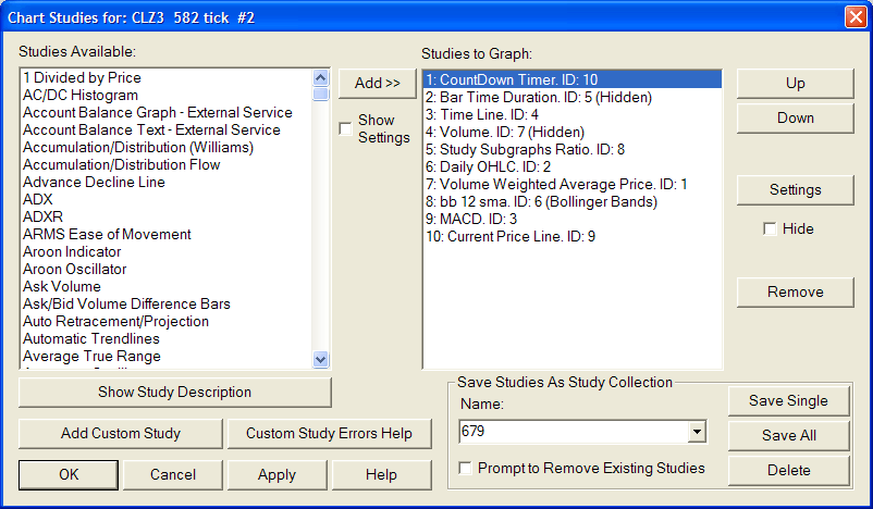 You can also set the Study Collection that you want to add to another Study Collection to Prompt To Remove Existing Studies and then you can apply it without removing the existing studies from the chart. This is explained on this page: http://www.sierrachart.com/index.php?l=doc/doc_StudyCollections.html Sierra Chart Support - Engineering Level Your definitive source for support. Other responses are from users. Try to keep your questions brief and to the point. Be aware of support policy: https://www.sierrachart.com/index.php?l=PostingInformation.php#GeneralInformation For the most reliable, advanced, and zero cost futures order routing, *change* to the Teton service: Sierra Chart Teton Futures Order Routing |